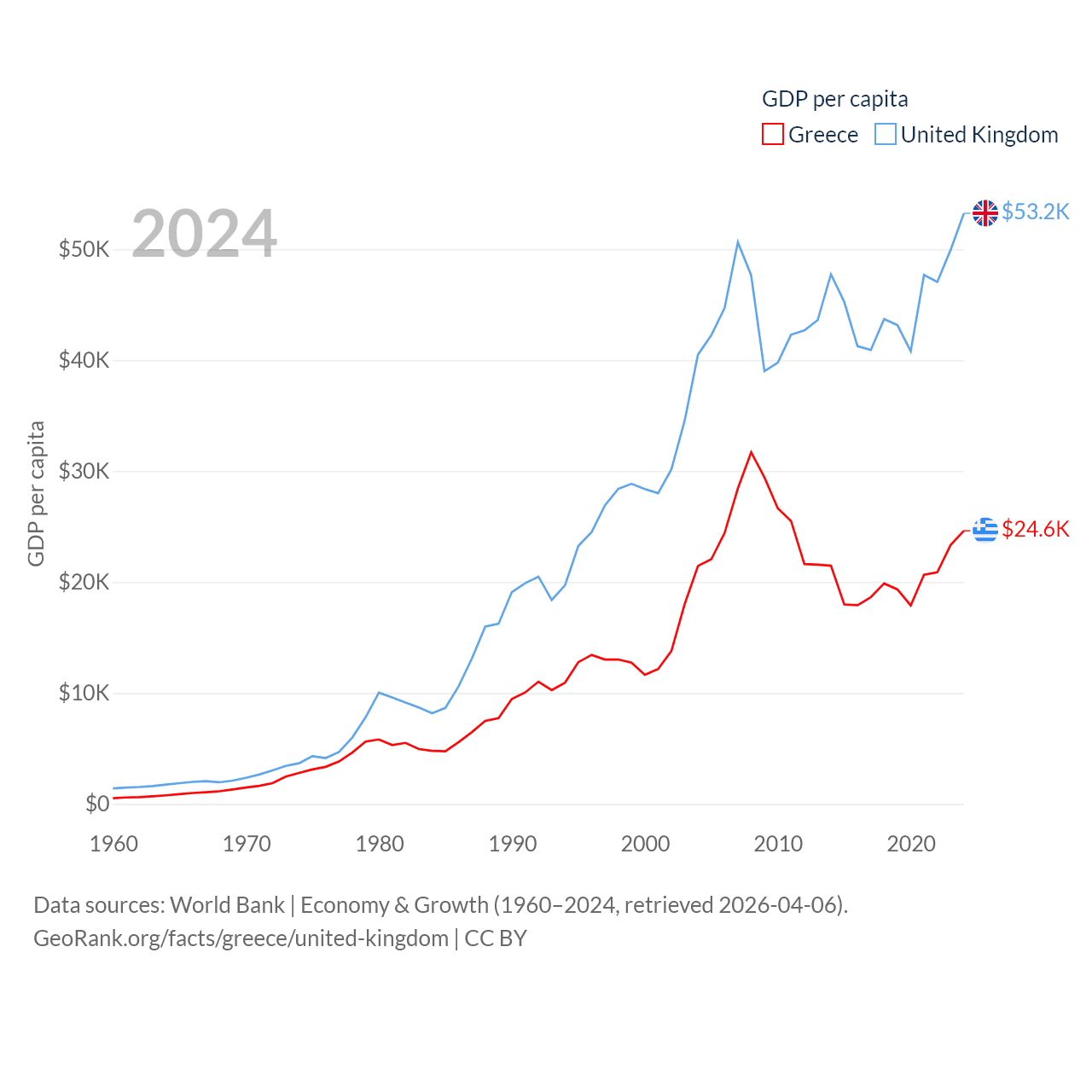 By GDP, Greece ranks 53/197 ($256B) and The United Kingdom ranks 6/197 ($3.69T). By GDP per capita, Greece ranks 49/197 ($24,626), while The United Kingdom ranks 22/197 ($53,246).