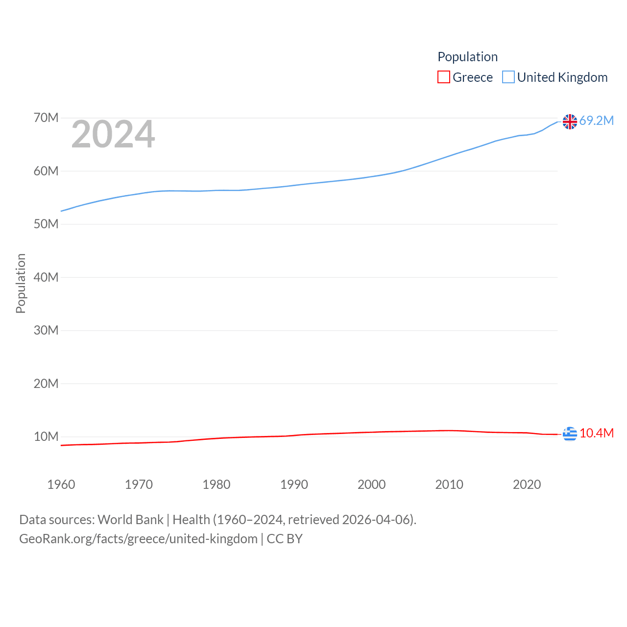 Greece has a population of 10.4M (ranked 94/197), compared with 69.2M in The United Kingdom (ranked 21/197). Greece's land area is 49,769 sq mi versus 93,410 sq mi for The United Kingdom (ranked 95th vs. 78th).