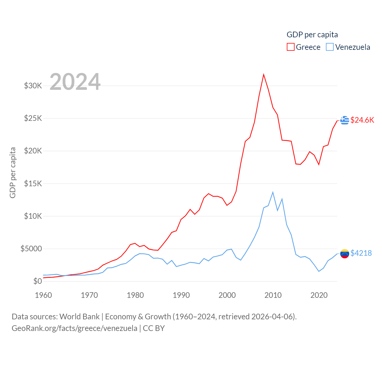 By GDP, Greece ranks 53/197 ($256B) and Venezuela ranks 65/197 ($120B). By GDP per capita, Greece ranks 49/197 ($24,626), while Venezuela ranks 128/197 ($4,218).