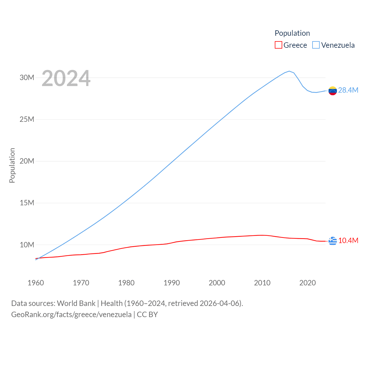 Greece has a population of 10.4M (ranked 94/197), compared with 28.4M in Venezuela (ranked 53/197). Greece's land area is 49,769 sq mi versus 340,561 sq mi for Venezuela (ranked 95th vs. 32nd).