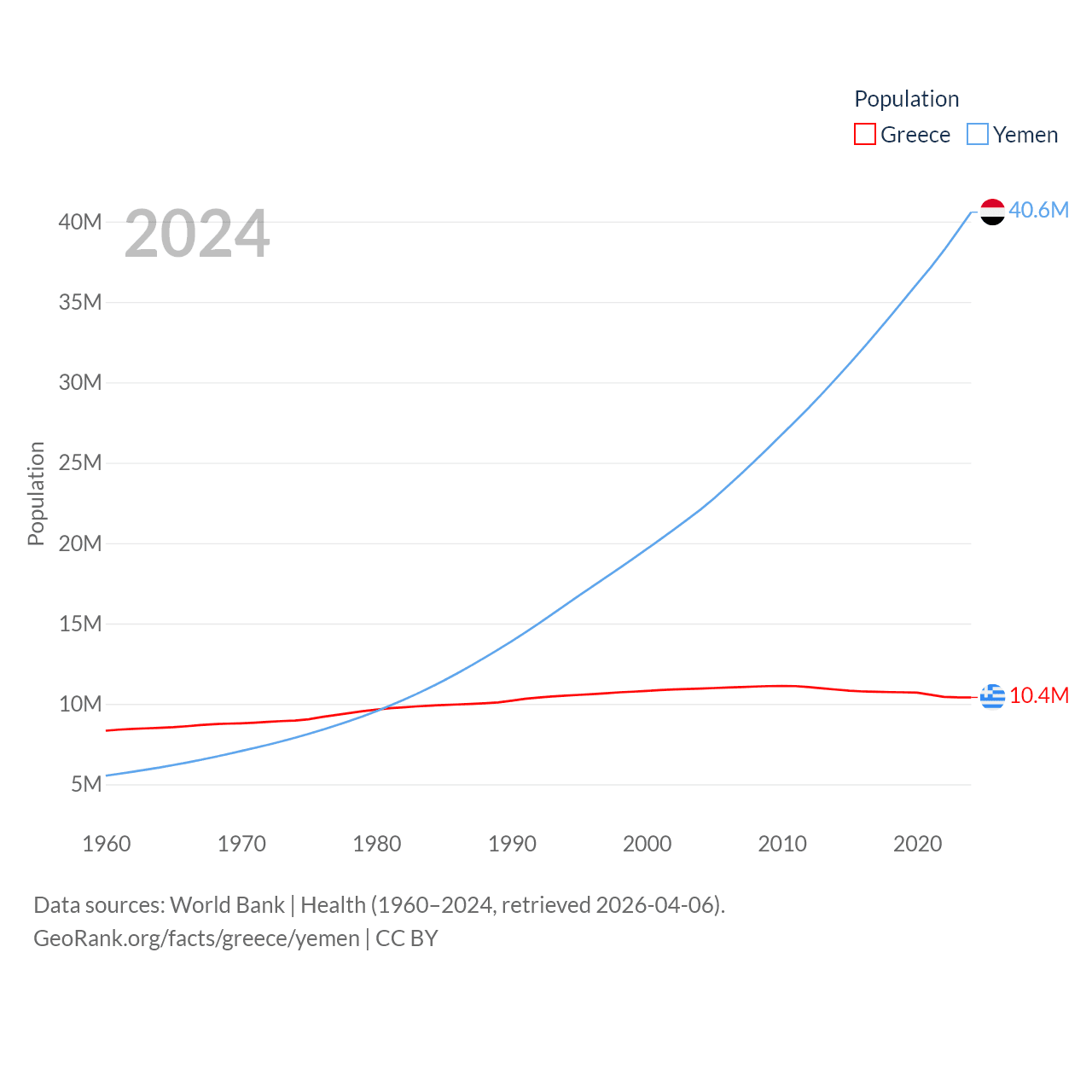 Greece has a population of 10.4M (ranked 94/197), compared with 40.6M in Yemen (ranked 38/197). Greece's land area is 49,769 sq mi versus 203,850 sq mi for Yemen (ranked 95th vs. 49th).