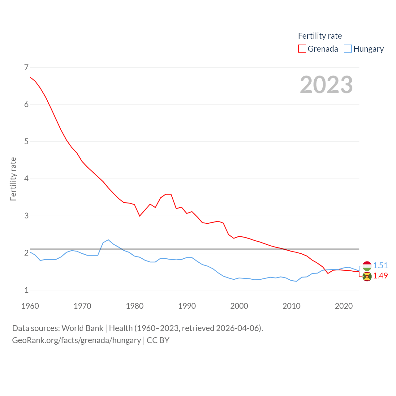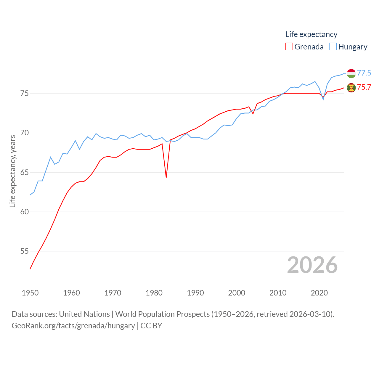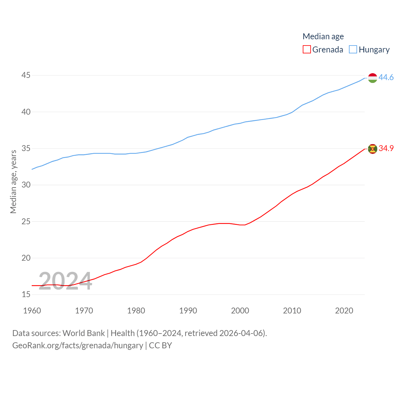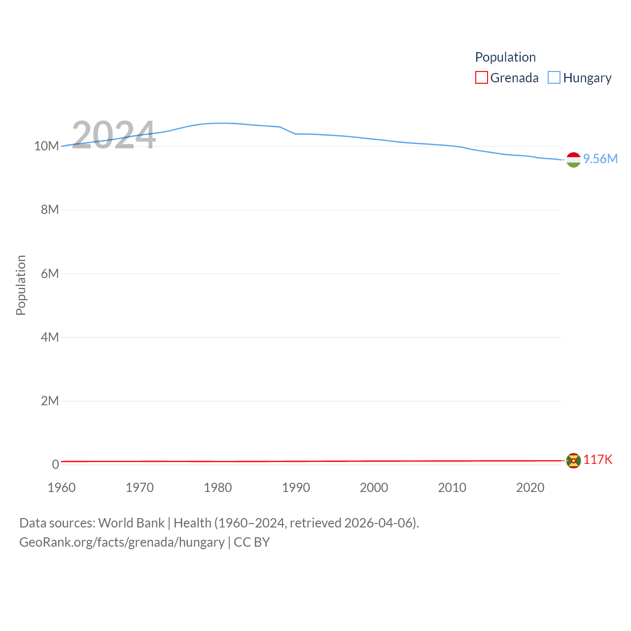 Grenada has a population of 117K (ranked 182/197), compared with 9.56M in Hungary (ranked 97/197). Grenada's land area is 131.3 sq mi versus 35,236 sq mi for Hungary (ranked 186th vs. 109th).