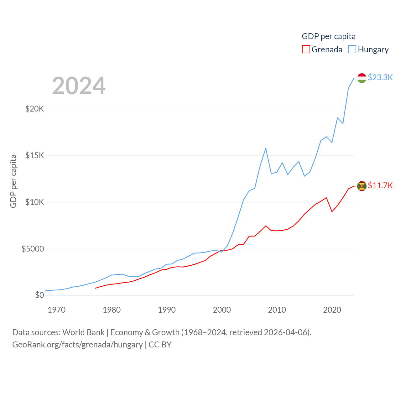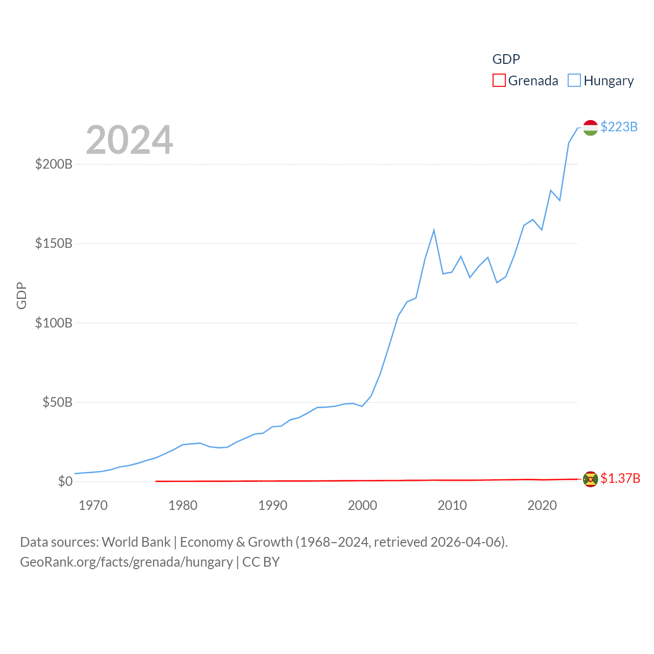 By GDP, Grenada ranks 184/197 ($1.37B) and Hungary ranks 55/197 ($223B). By GDP per capita, Grenada ranks 80/197 ($11,705), while Hungary ranks 55/197 ($23,292).