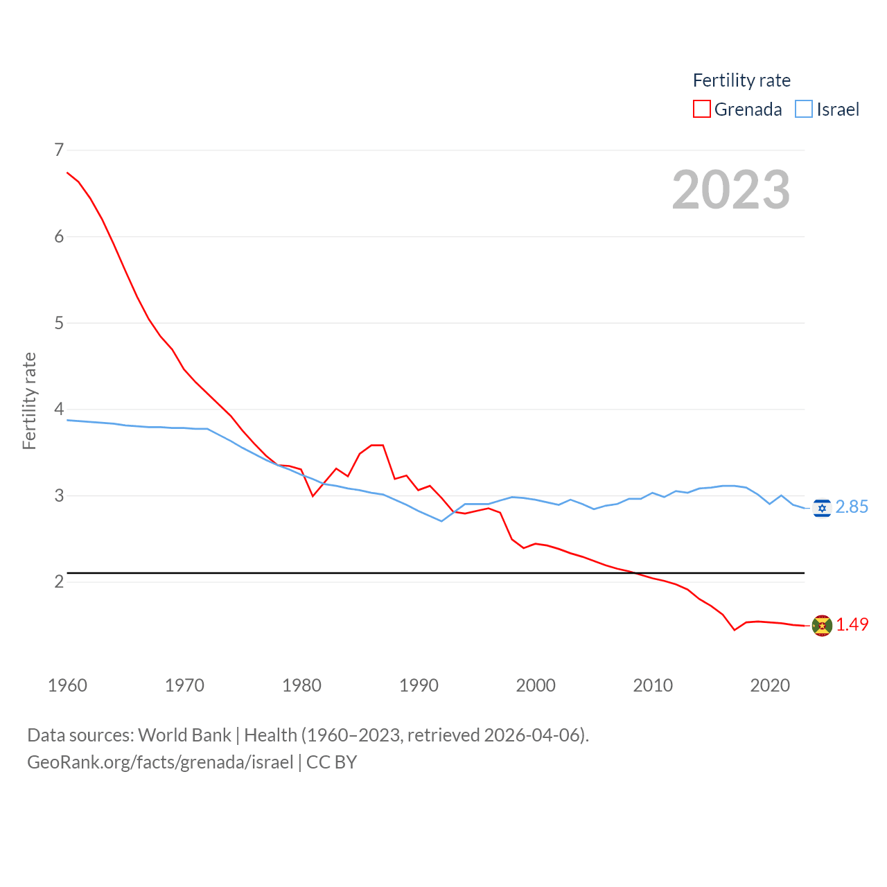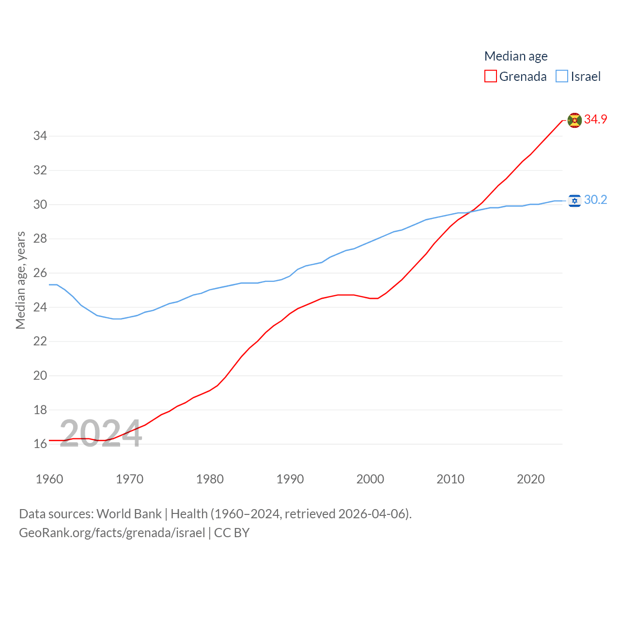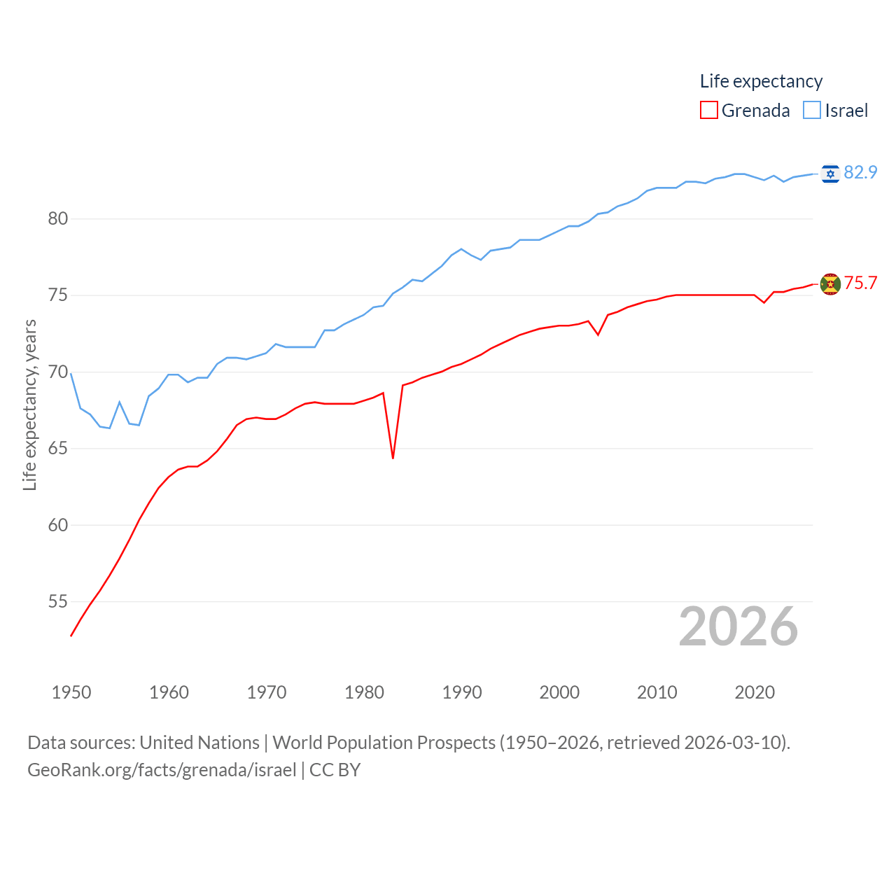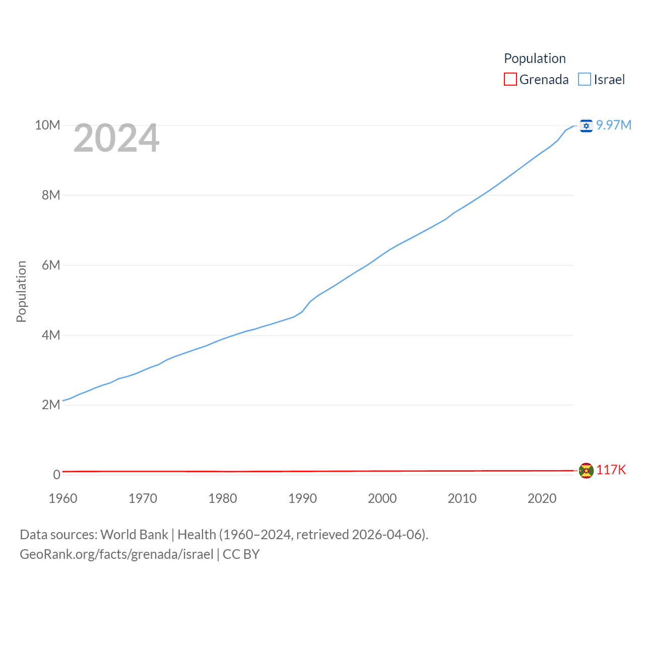 Grenada has a population of 117K (ranked 182/197), compared with 9.97M in Israel (ranked 96/197). Grenada's land area is 131.3 sq mi versus 8,355 sq mi for Israel (ranked 186th vs. 149th).