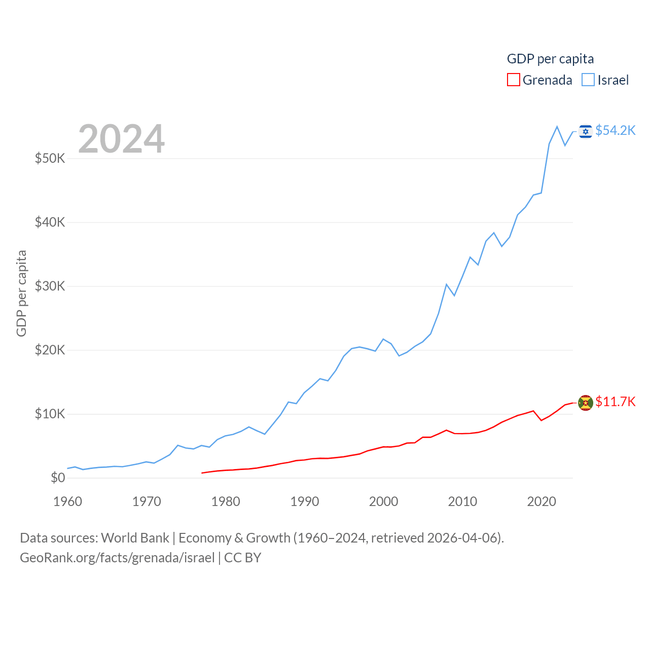 By GDP, Grenada ranks 184/197 ($1.37B) and Israel ranks 29/197 ($540B). By GDP per capita, Grenada ranks 80/197 ($11,705), while Israel ranks 21/197 ($54,177).
