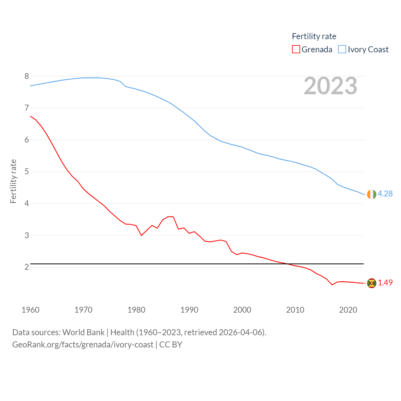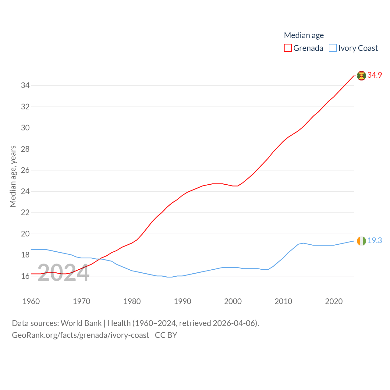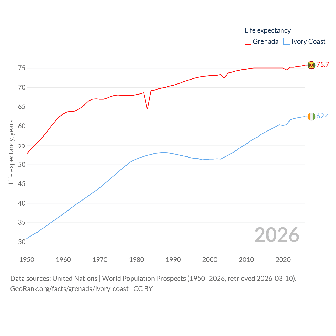 Grenada has a population of 117K (ranked 182/197), compared with 31.9M in Ivory Coast (ranked 50/197). Grenada's land area is 131.3 sq mi versus 122,780 sq mi for Ivory Coast (ranked 186th vs. 66th).