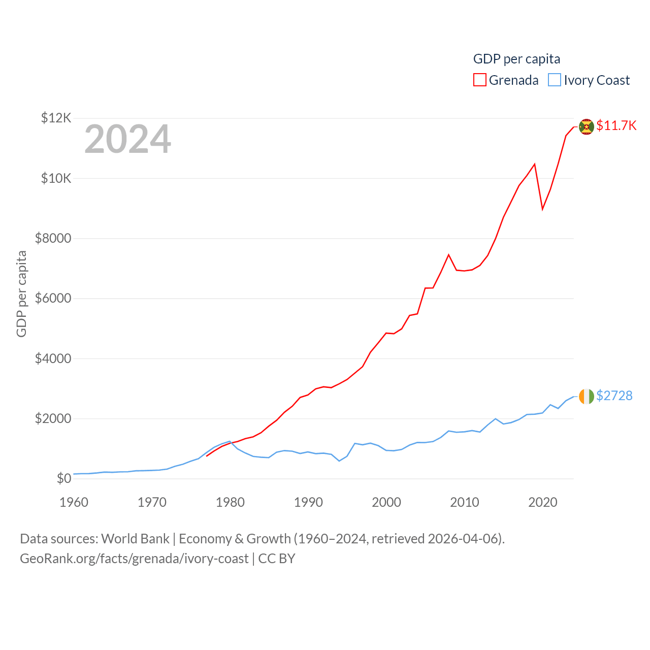 By GDP, Grenada ranks 184/197 ($1.37B) and Ivory Coast ranks 77/197 ($87.1B). By GDP per capita, Grenada ranks 80/197 ($11,705), while Ivory Coast ranks 142/197 ($2,728).