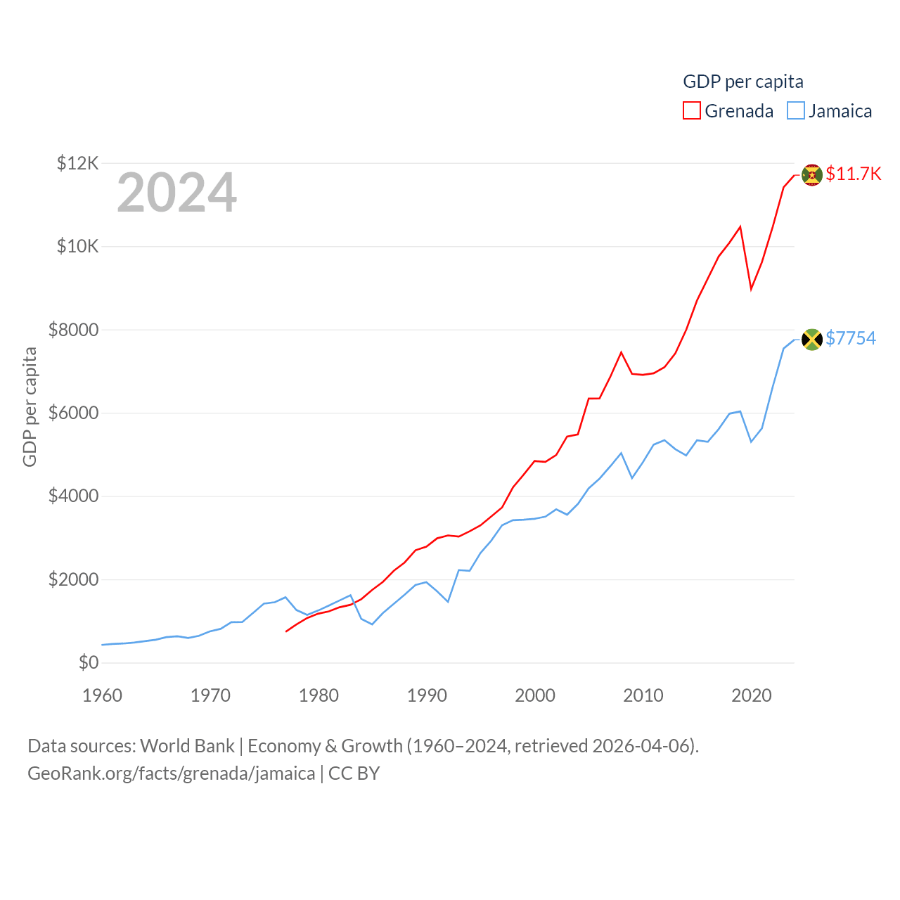 By GDP, Grenada ranks 184/197 ($1.37B) and Jamaica ranks 124/197 ($22B). By GDP per capita, Grenada ranks 80/197 ($11,705), while Jamaica ranks 95/197 ($7,754).
