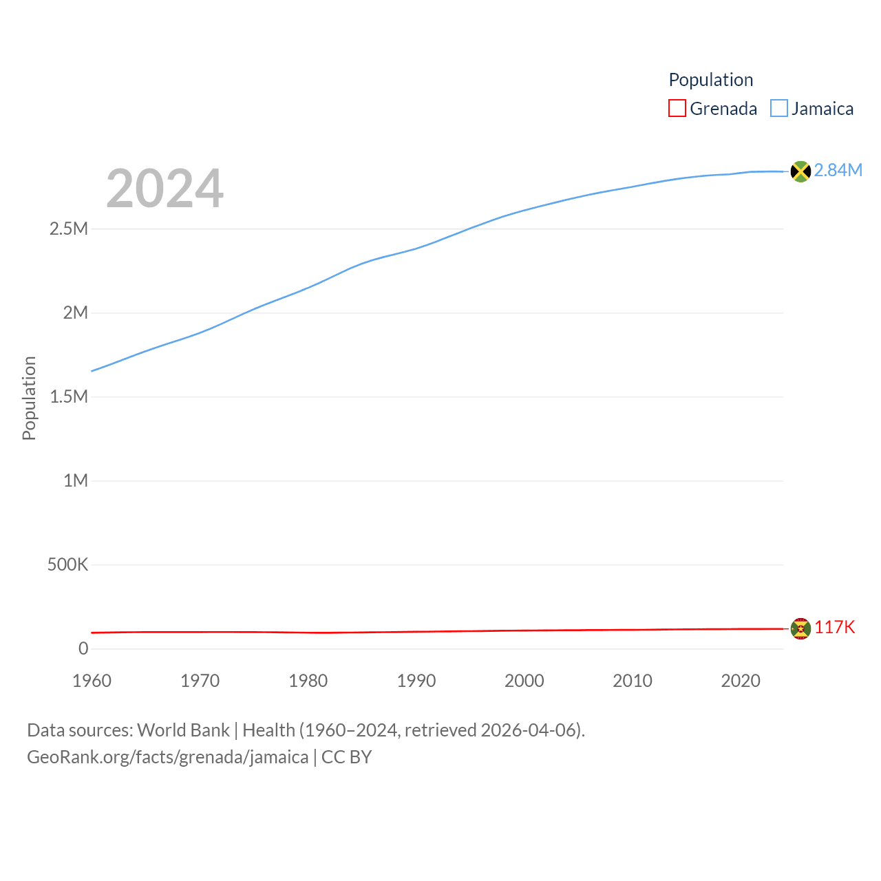 Grenada has a population of 117K (ranked 182/197), compared with 2.84M in Jamaica (ranked 139/197). Grenada's land area is 131.3 sq mi versus 4,181 sq mi for Jamaica (ranked 186th vs. 159th).