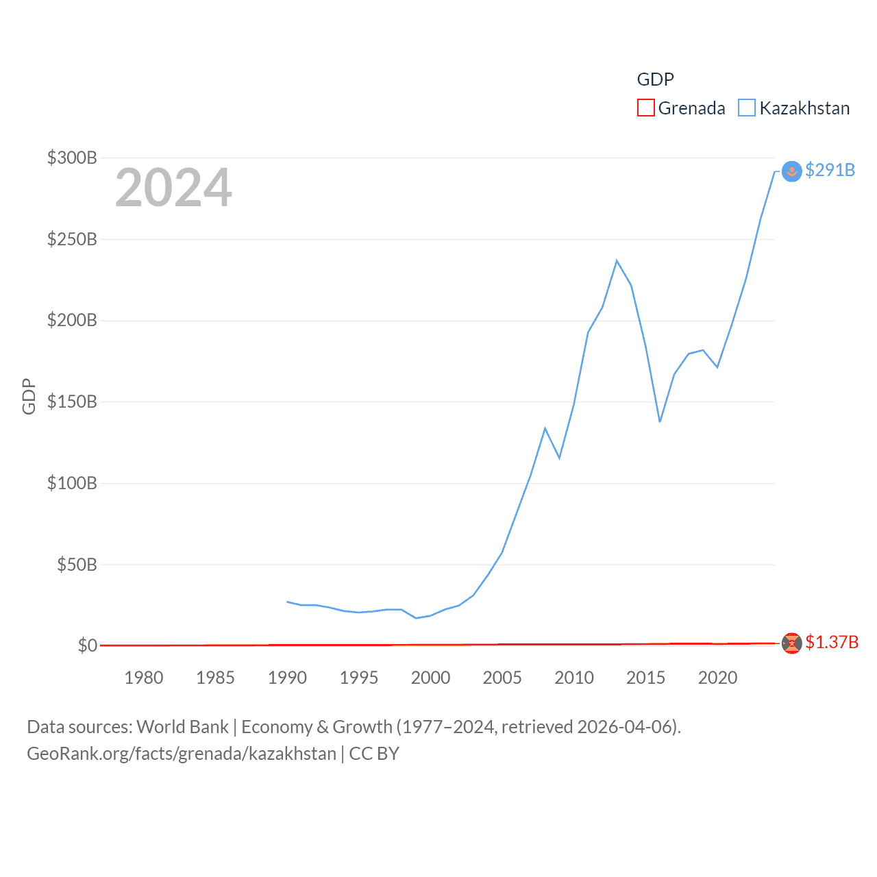 By GDP, Grenada ranks 184/197 ($1.37B) and Kazakhstan ranks 48/197 ($291B). By GDP per capita, Grenada ranks 80/197 ($11,705), while Kazakhstan ranks 71/197 ($14,155).