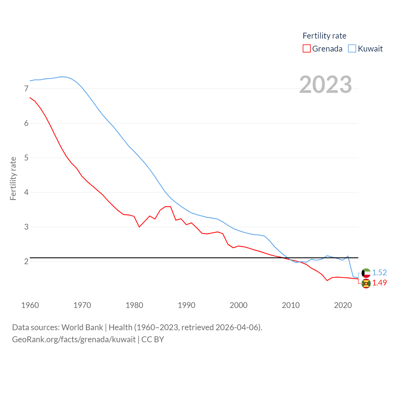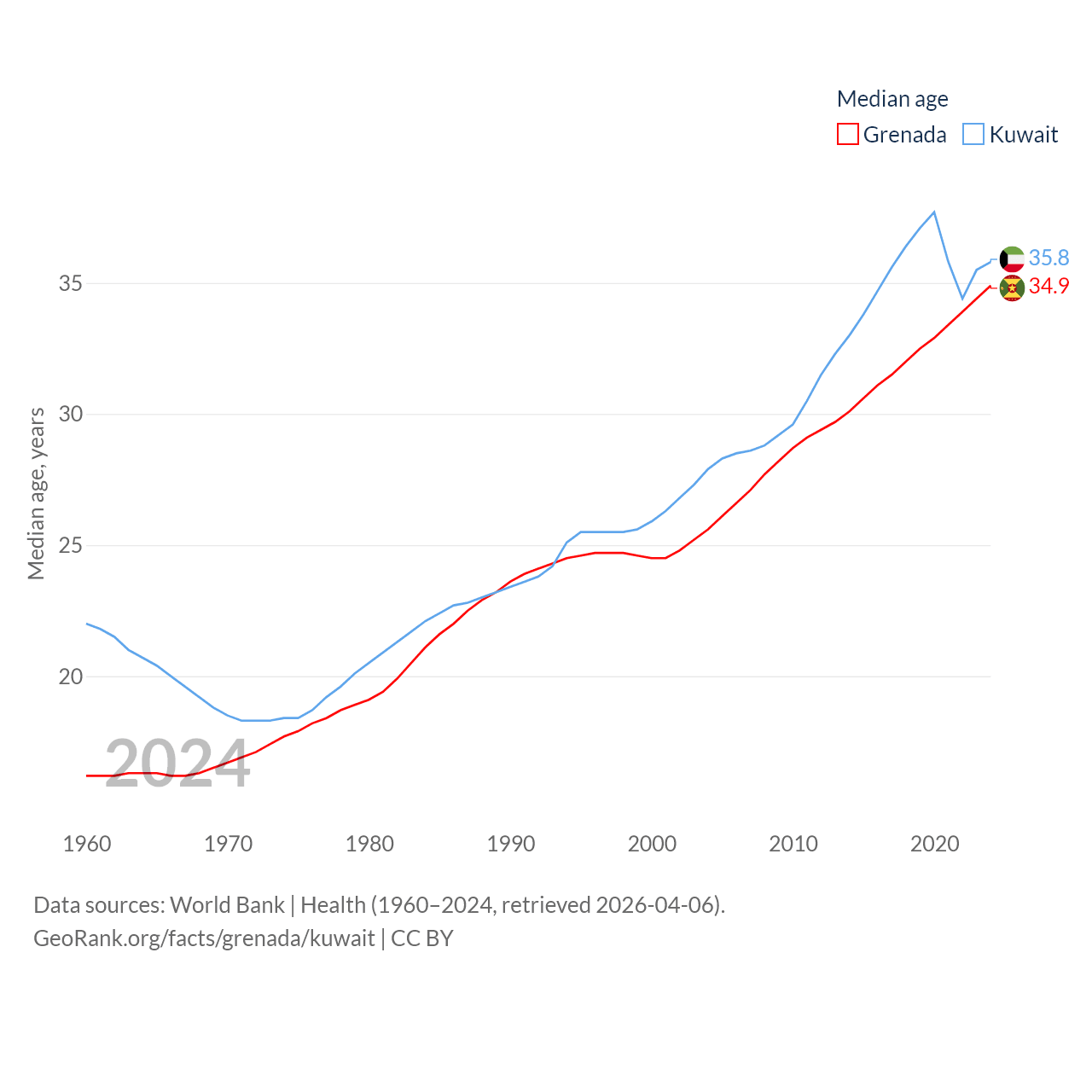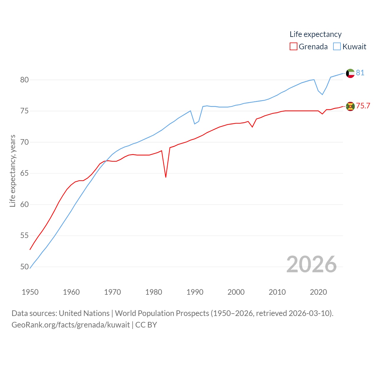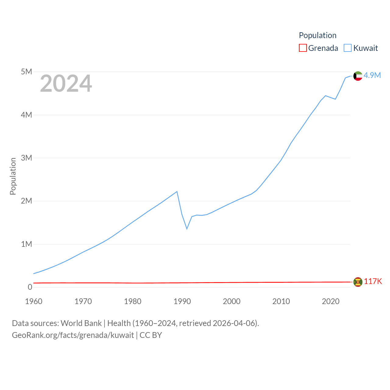 Grenada has a population of 117K (ranked 182/197), compared with 4.9M in Kuwait (ranked 127/197). Grenada's land area is 131.3 sq mi versus 6,880 sq mi for Kuwait (ranked 186th vs. 153rd).