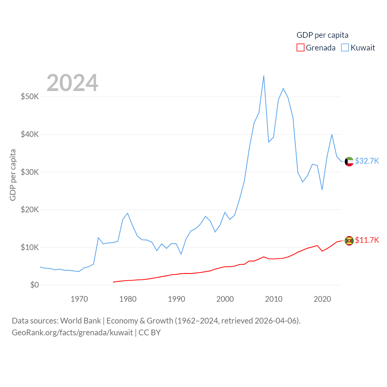 By GDP, Grenada ranks 184/197 ($1.37B) and Kuwait ranks 59/197 ($160B). By GDP per capita, Grenada ranks 80/197 ($11,705), while Kuwait ranks 37/197 ($32,718).