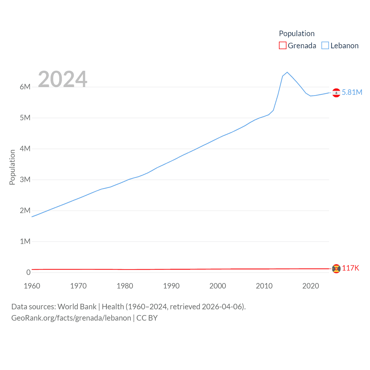Grenada has a population of 117K (ranked 182/197), compared with 5.81M in Lebanon (ranked 115/197). Grenada's land area is 131.3 sq mi versus 3,950 sq mi for Lebanon (ranked 186th vs. 160th).