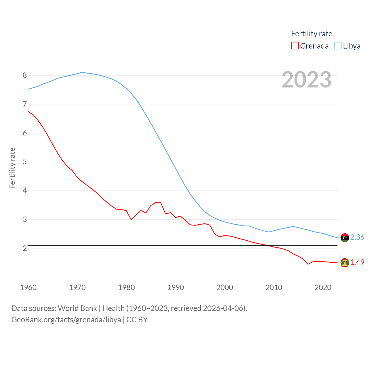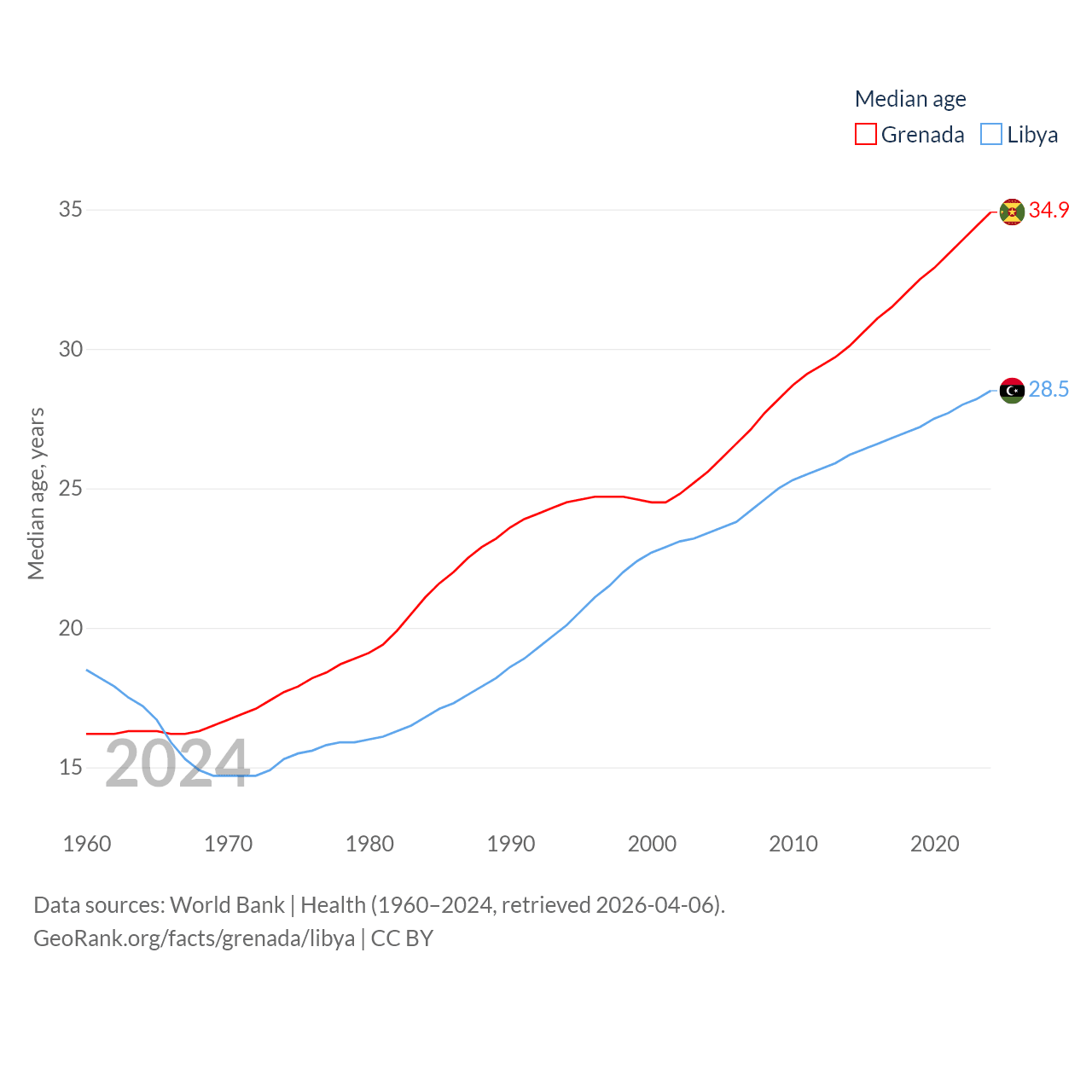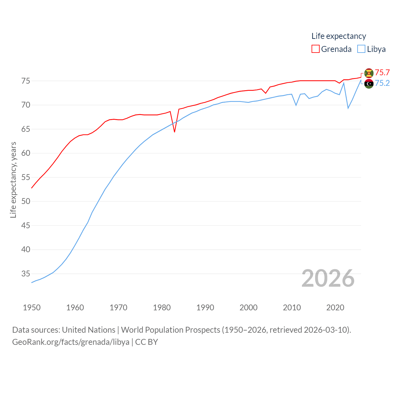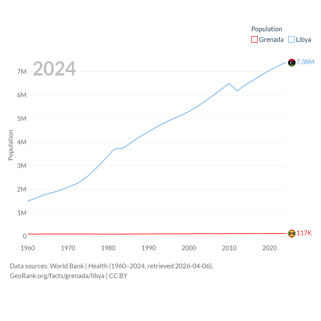 Grenada has a population of 117K (ranked 182/197), compared with 7.38M in Libya (ranked 105/197). Grenada's land area is 131.3 sq mi versus 679,362 sq mi for Libya (ranked 186th vs. 16th).