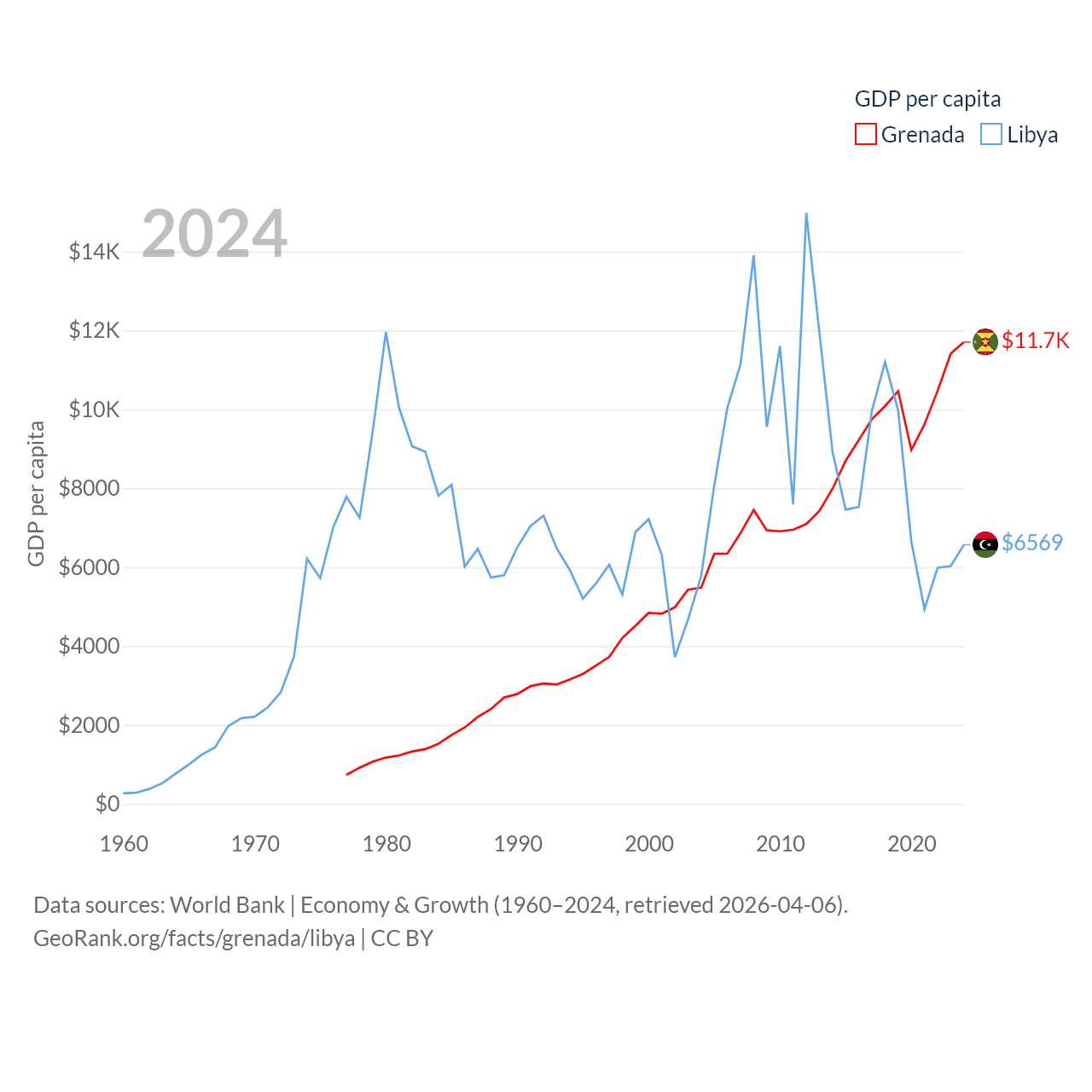By GDP, Grenada ranks 184/197 ($1.37B) and Libya ranks 95/197 ($48.5B). By GDP per capita, Grenada ranks 80/197 ($11,705), while Libya ranks 107/197 ($6,569).