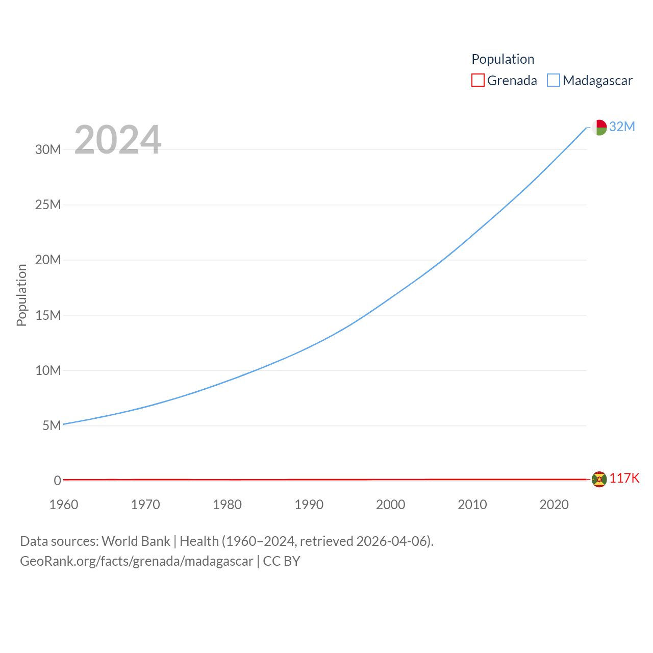 Grenada has a population of 117K (ranked 182/197), compared with 32M in Madagascar (ranked 49/197). Grenada's land area is 131.3 sq mi versus 224,634 sq mi for Madagascar (ranked 186th vs. 44th).