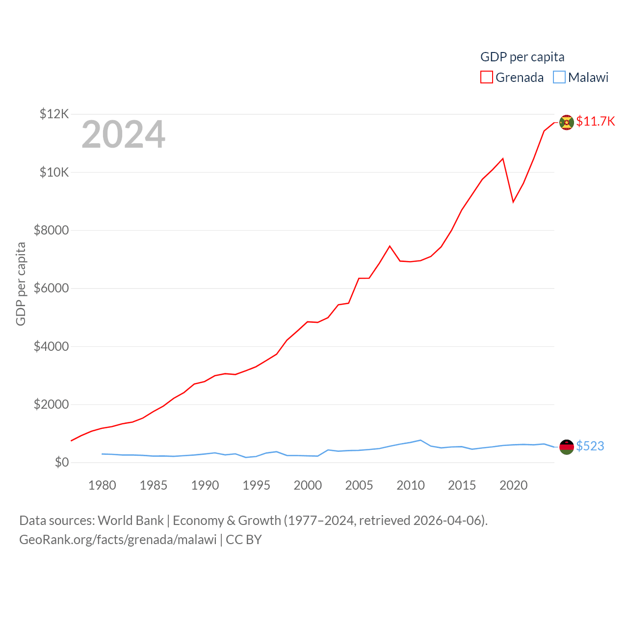 By GDP, Grenada ranks 184/197 ($1.37B) and Malawi ranks 151/197 ($11.3B). By GDP per capita, Grenada ranks 80/197 ($11,705), while Malawi ranks 194/197 ($523).