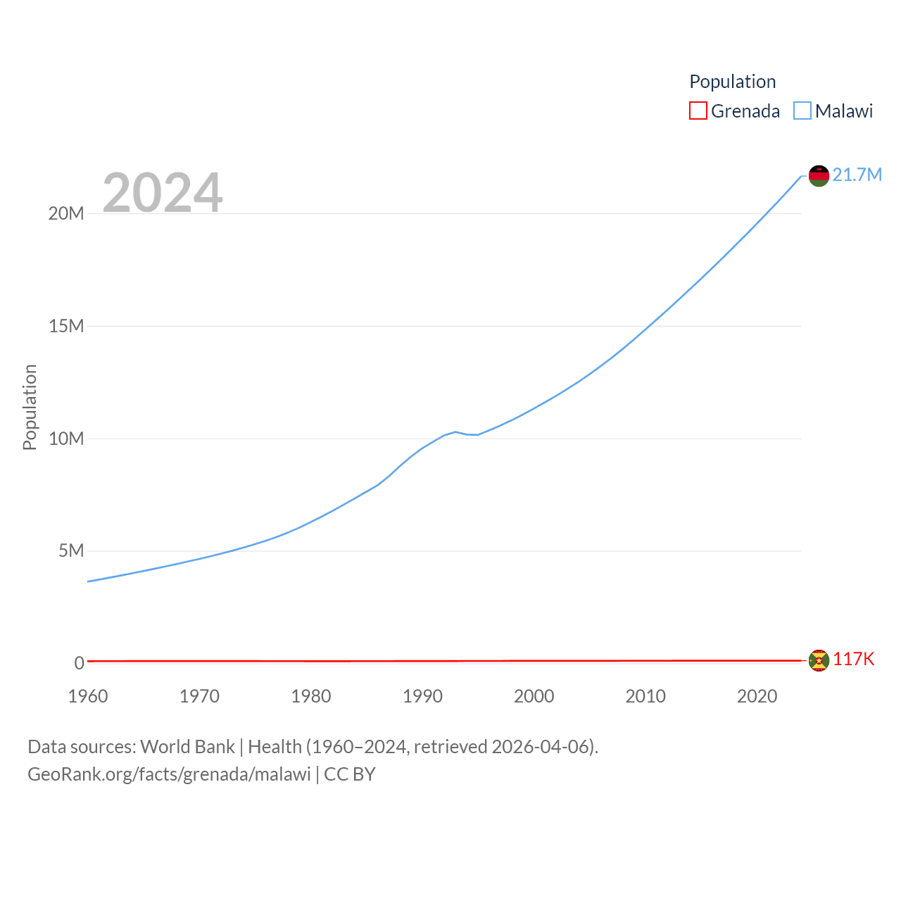Grenada has a population of 117K (ranked 182/197), compared with 21.7M in Malawi (ranked 62/197). Grenada's land area is 131.3 sq mi versus 36,402 sq mi for Malawi (ranked 186th vs. 107th).