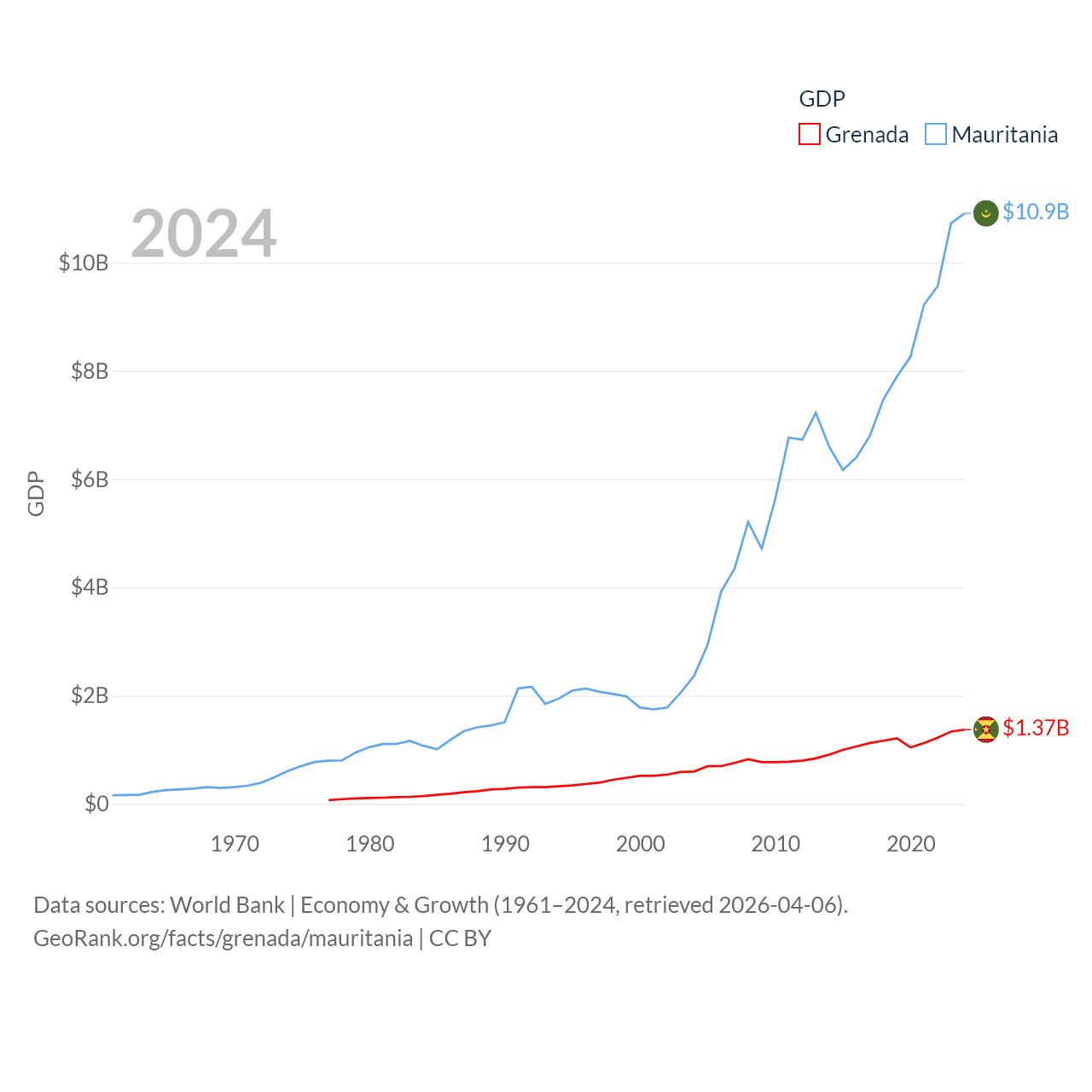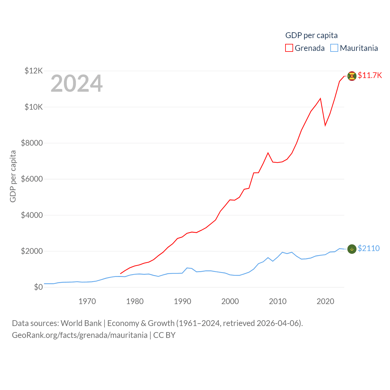 By GDP, Grenada ranks 184/197 ($1.37B) and Mauritania ranks 153/197 ($10.9B). By GDP per capita, Grenada ranks 80/197 ($11,705), while Mauritania ranks 156/197 ($2,110).