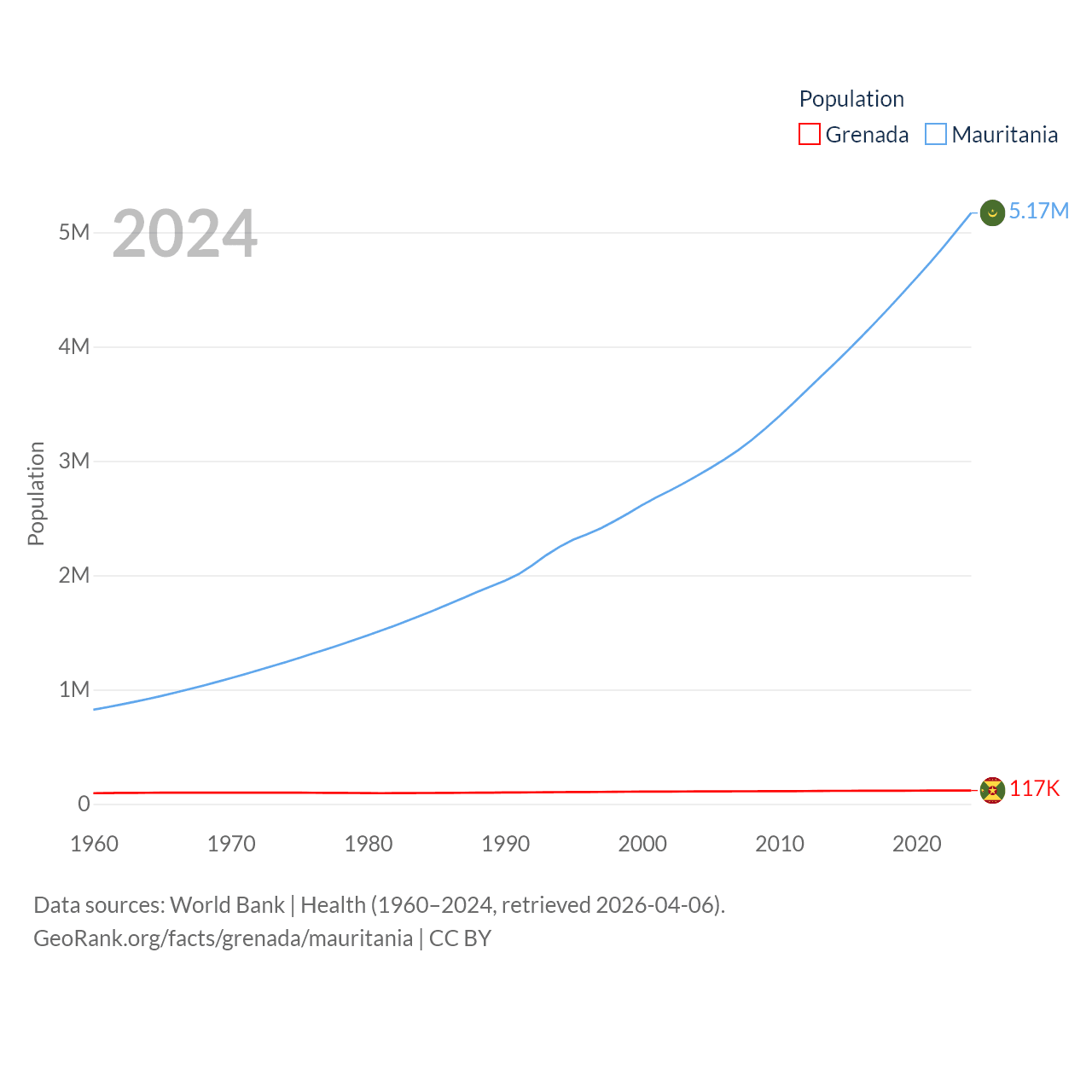 Grenada has a population of 117K (ranked 182/197), compared with 5.17M in Mauritania (ranked 125/197). Grenada's land area is 131.3 sq mi versus 397,955 sq mi for Mauritania (ranked 186th vs. 28th).