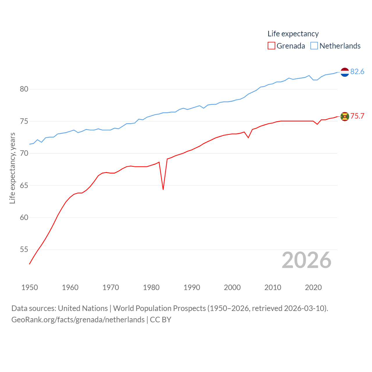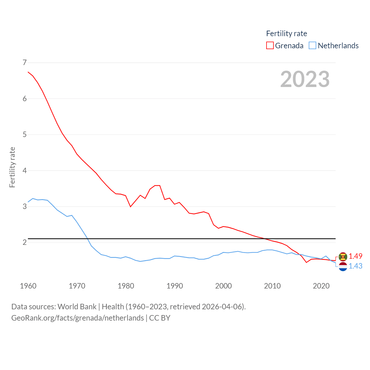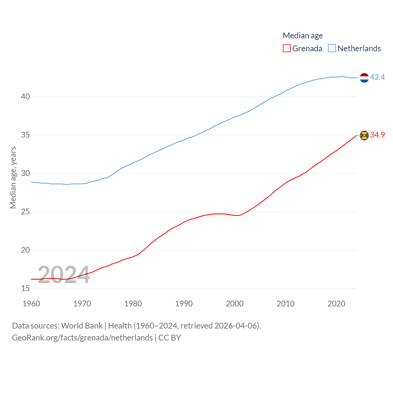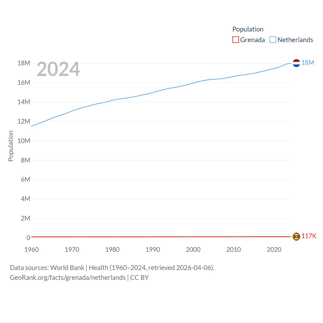 Grenada has a population of 117K (ranked 182/197), compared with 18M in The Netherlands (ranked 72/197). Grenada's land area is 131.3 sq mi versus 13,000 sq mi for The Netherlands (ranked 186th vs. 134th).