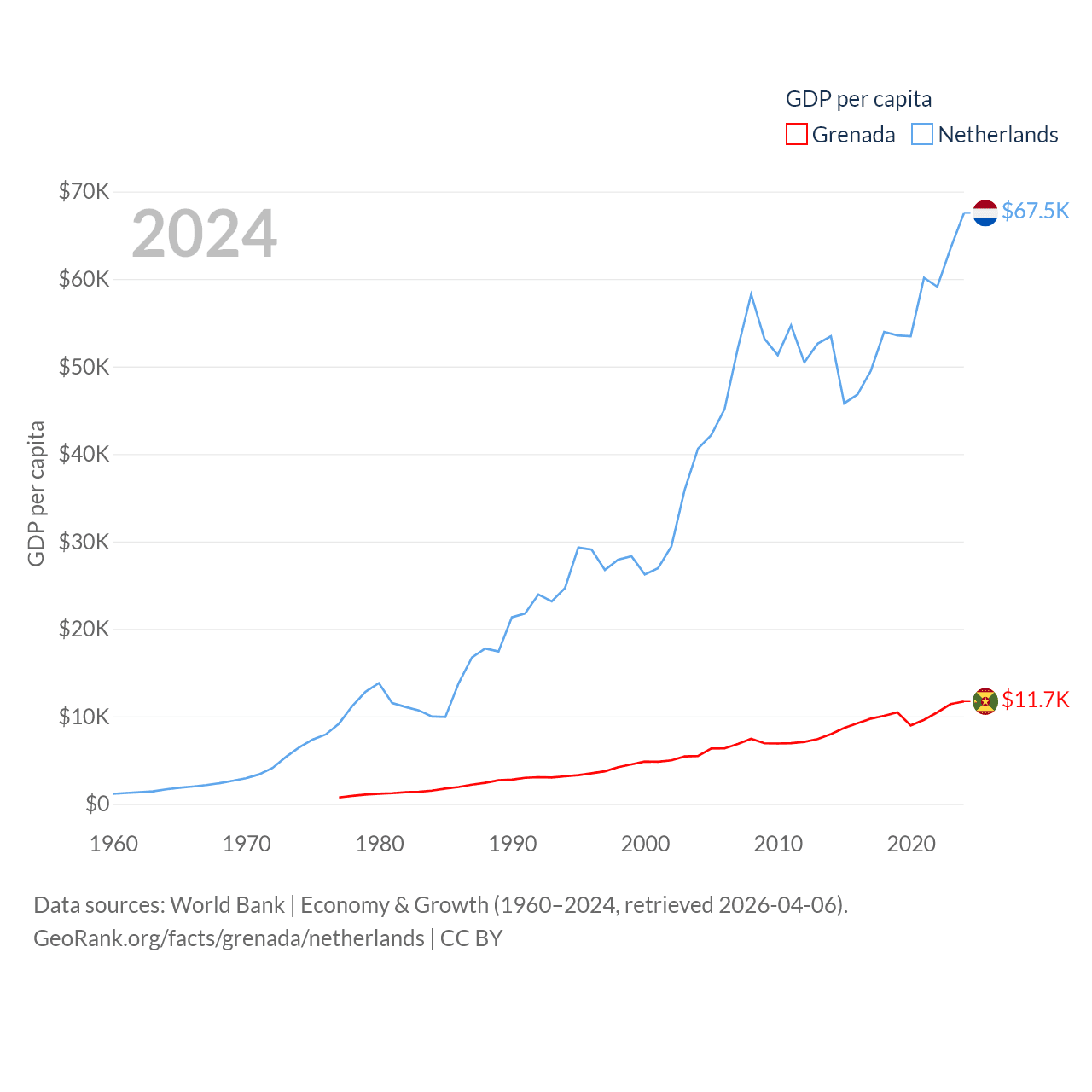 By GDP, Grenada ranks 184/197 ($1.37B) and The Netherlands ranks 19/197 ($1.21T). By GDP per capita, Grenada ranks 80/197 ($11,705), while The Netherlands ranks 13/197 ($67,520).