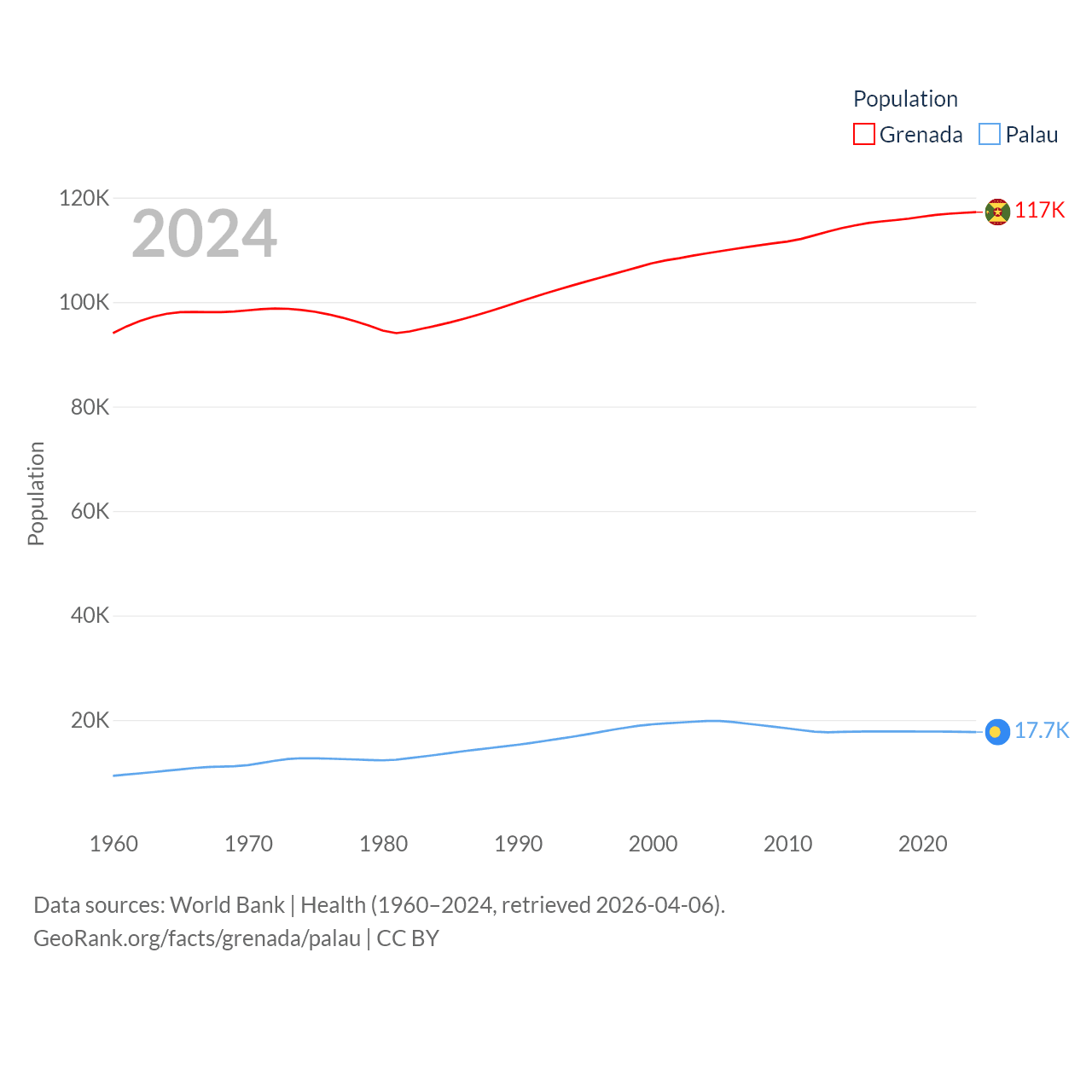 Grenada has a population of 117K (ranked 182/197), compared with 17.7K in Palau (ranked 194/197). Grenada's land area is 131.3 sq mi versus 177.6 sq mi for Palau (ranked 186th vs. 180th).