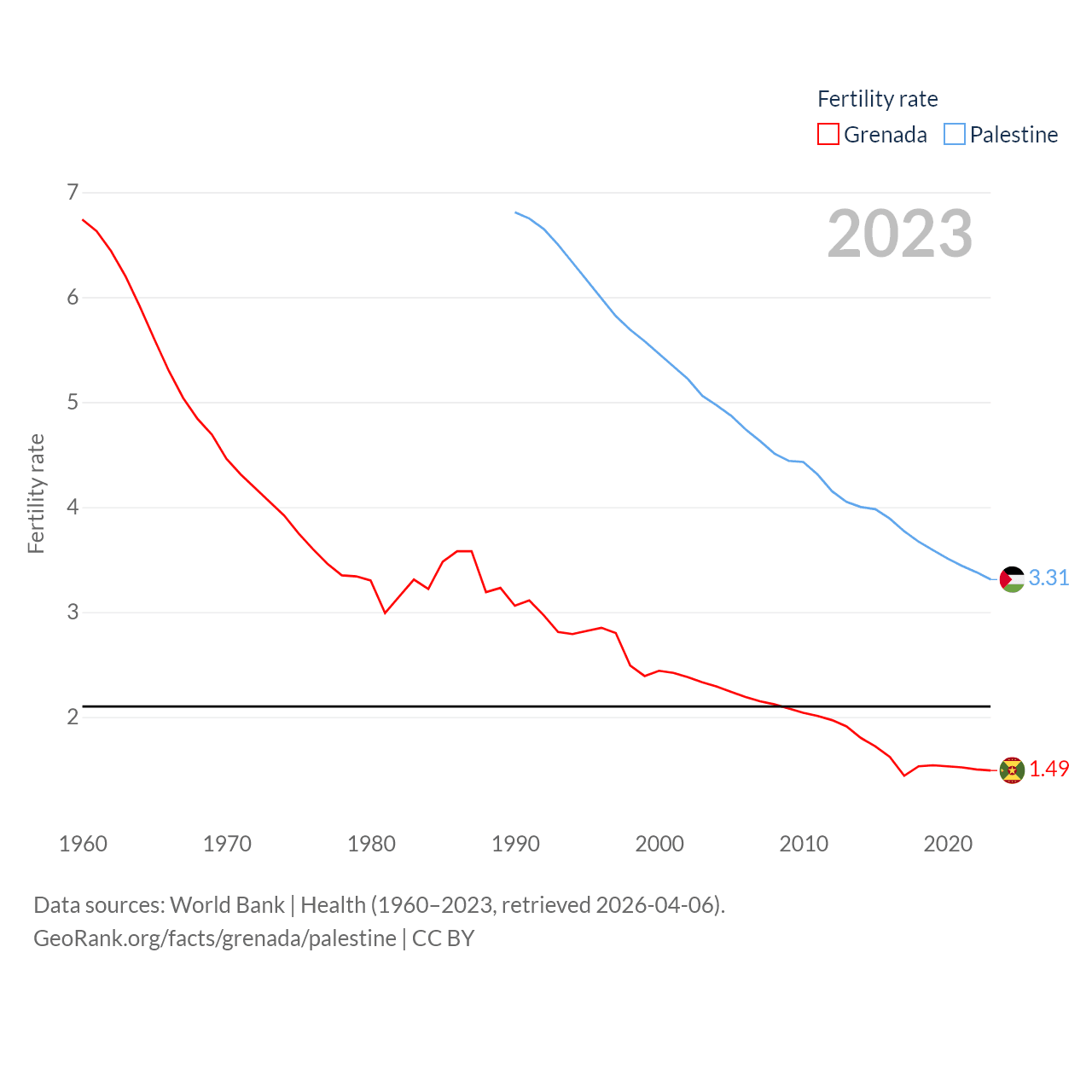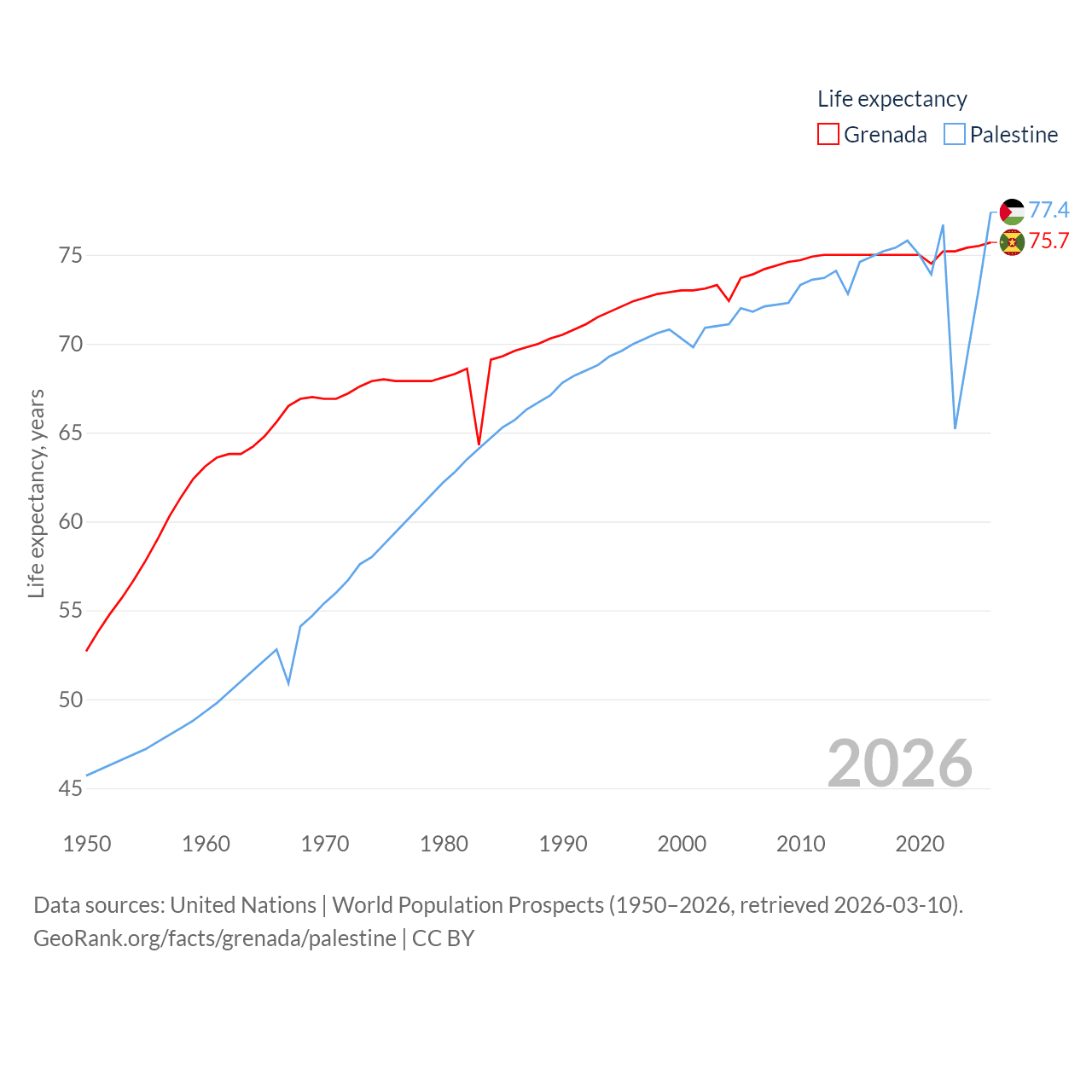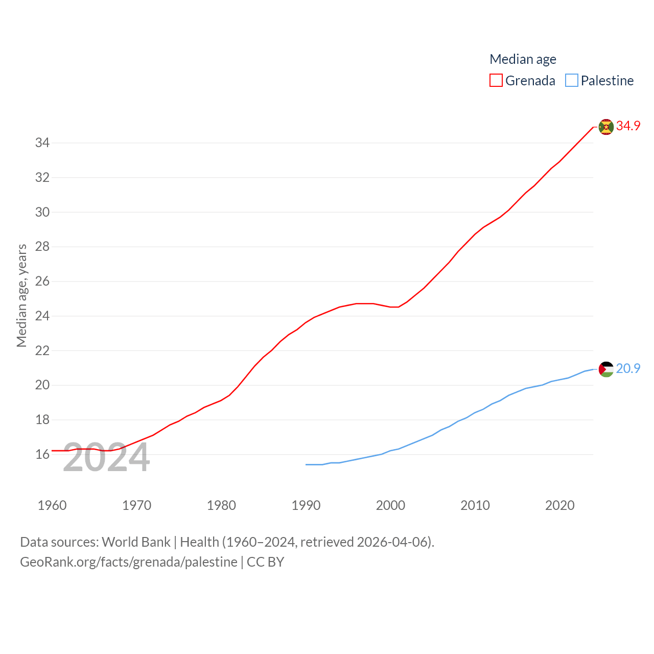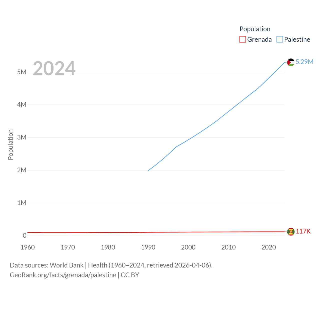Grenada has a population of 117K (ranked 182/197), compared with 5.29M in Palestine (ranked 122/197). Grenada's land area is 131.3 sq mi versus 2,326 sq mi for Palestine (ranked 186th vs. 164th).