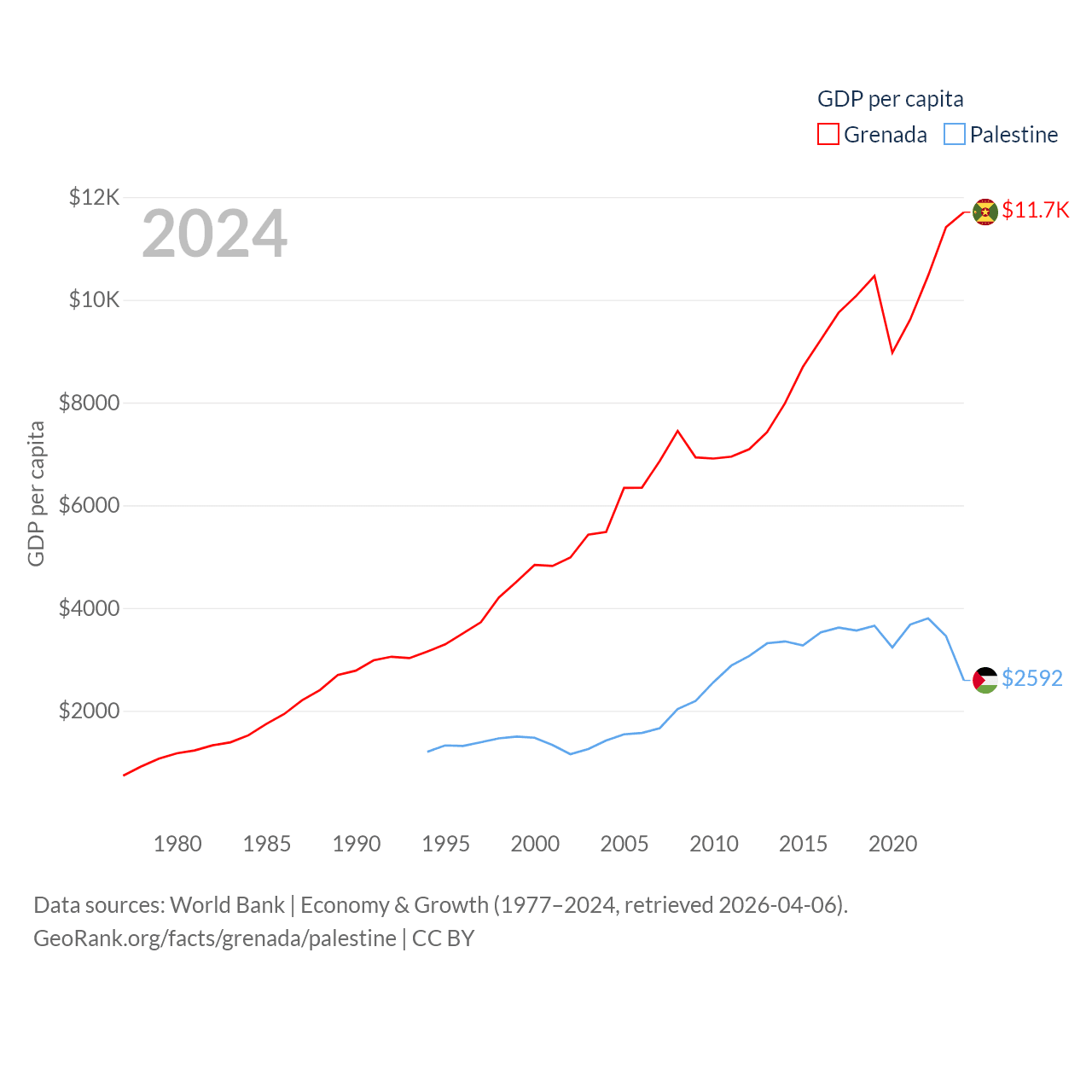 By GDP, Grenada ranks 184/197 ($1.37B) and Palestine ranks 146/197 ($13.7B). By GDP per capita, Grenada ranks 80/197 ($11,705), while Palestine ranks 147/197 ($2,592).