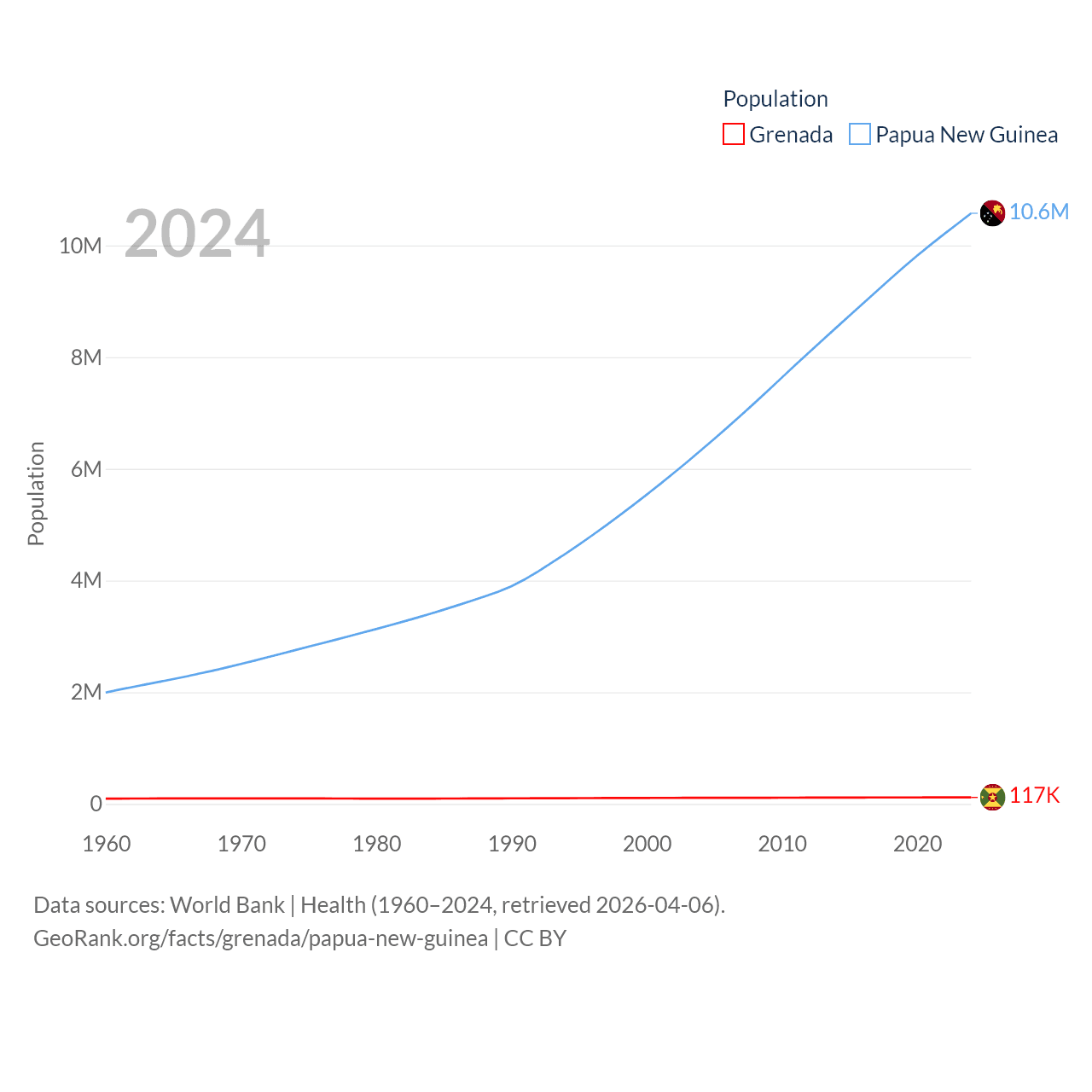 Grenada has a population of 117K (ranked 182/197), compared with 10.6M in Papua New Guinea (ranked 92/197). Grenada's land area is 131.3 sq mi versus 174,850 sq mi for Papua New Guinea (ranked 186th vs. 54th).