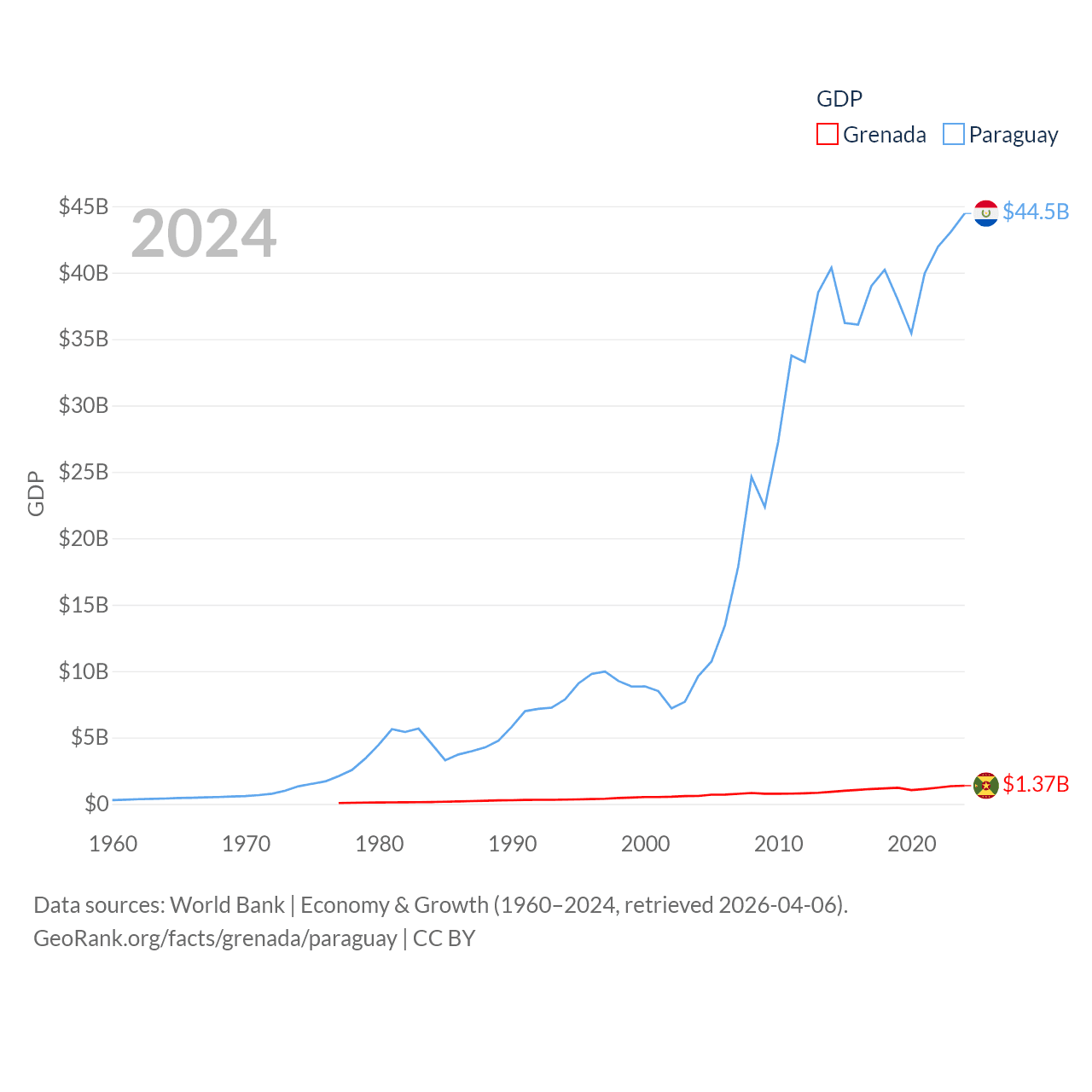 By GDP, Grenada ranks 184/197 ($1.37B) and Paraguay ranks 98/197 ($44.5B). By GDP per capita, Grenada ranks 80/197 ($11,705), while Paraguay ranks 109/197 ($6,416).