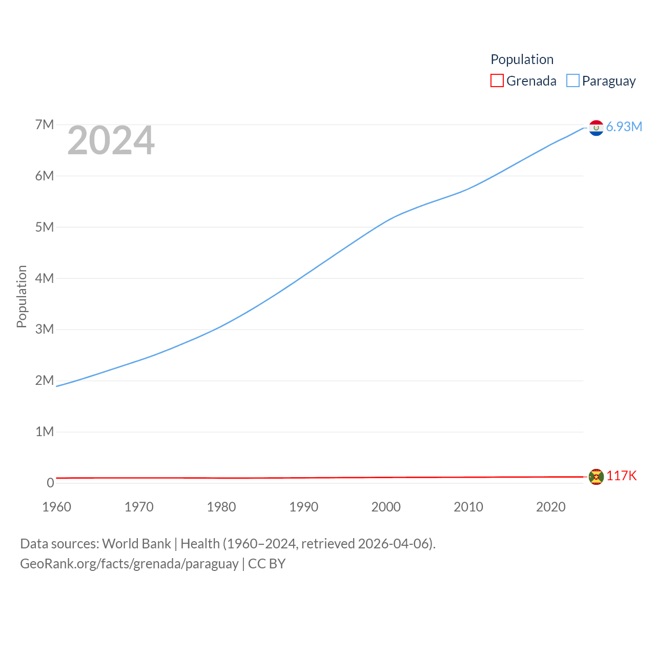 Grenada has a population of 117K (ranked 182/197), compared with 6.93M in Paraguay (ranked 107/197). Grenada's land area is 131.3 sq mi versus 152,901 sq mi for Paraguay (ranked 186th vs. 59th).