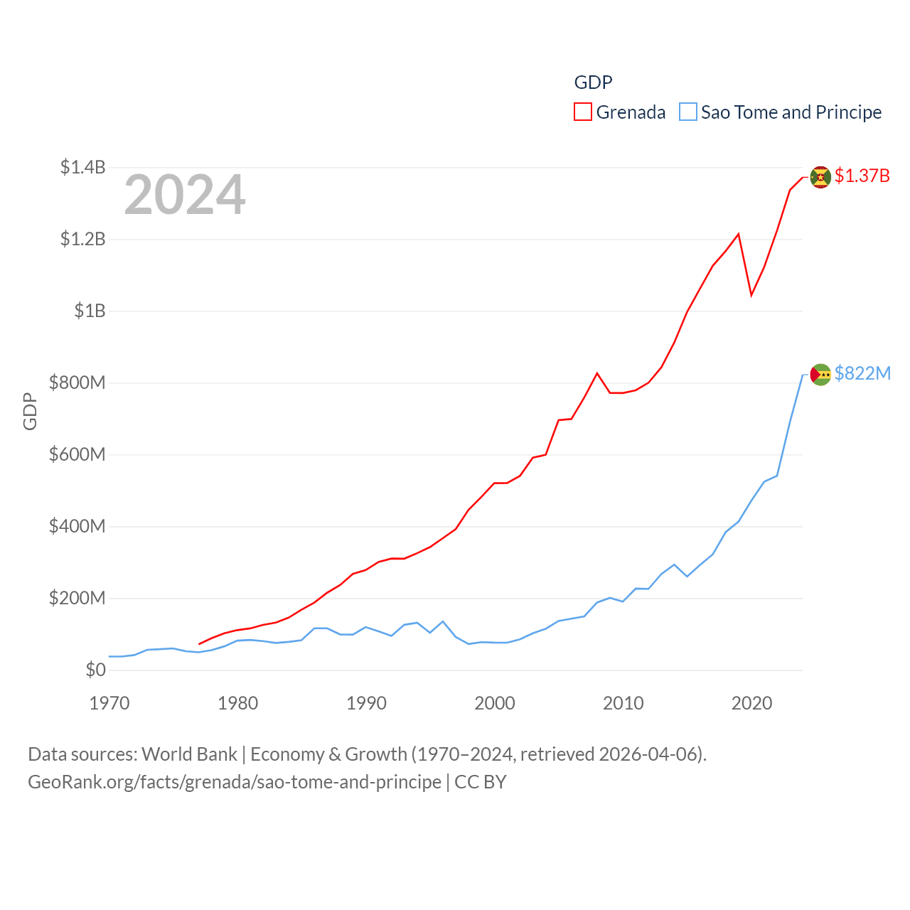 By GDP, Grenada ranks 184/197 ($1.37B) and Sao Tome and Principe ranks 189/197 ($822M). By GDP per capita, Grenada ranks 80/197 ($11,705), while Sao Tome and Principe ranks 134/197 ($3,491).