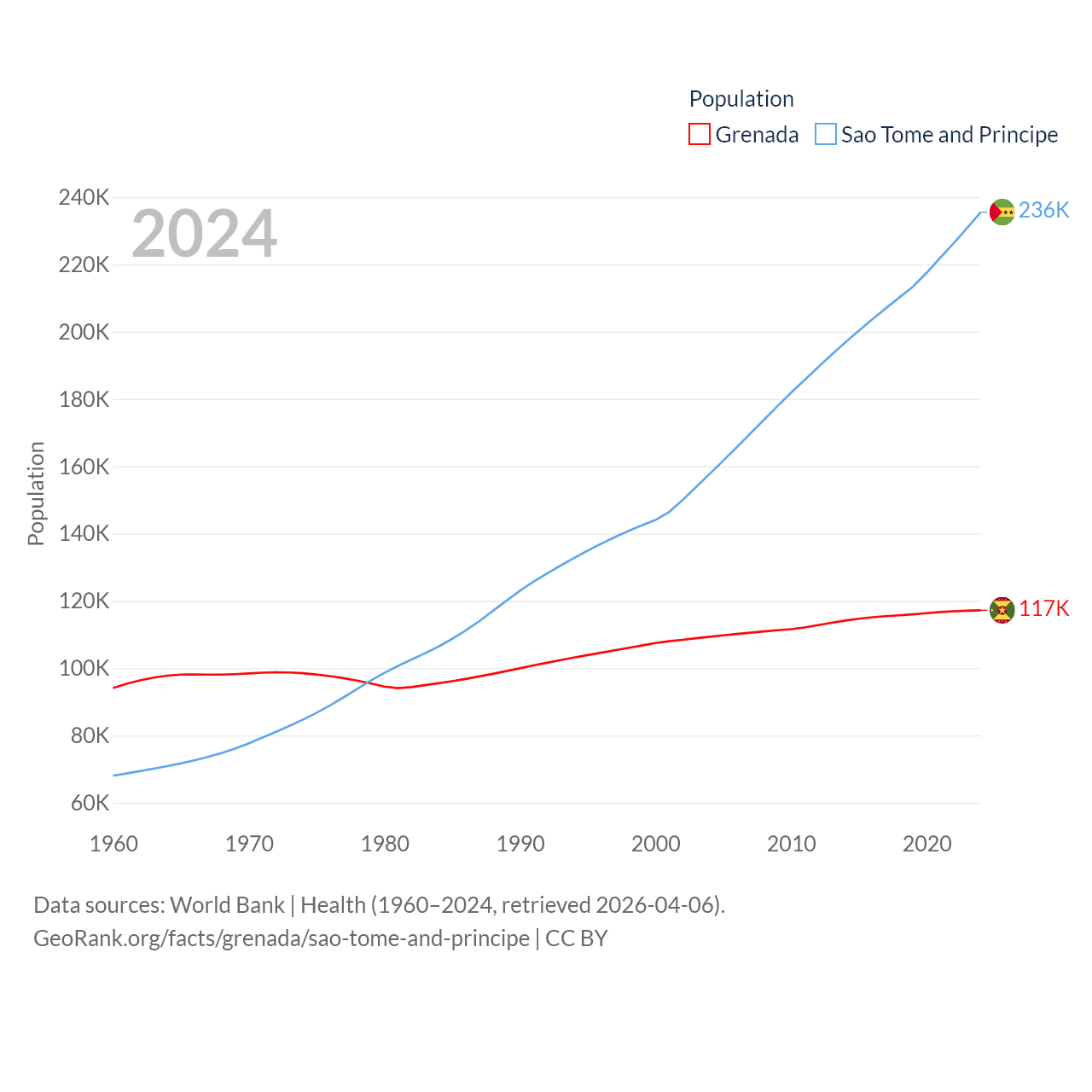 Grenada has a population of 117K (ranked 182/197), compared with 236K in Sao Tome and Principe (ranked 176/197). Grenada's land area is 131.3 sq mi versus 371 sq mi for Sao Tome and Principe (ranked 186th vs. 172nd).