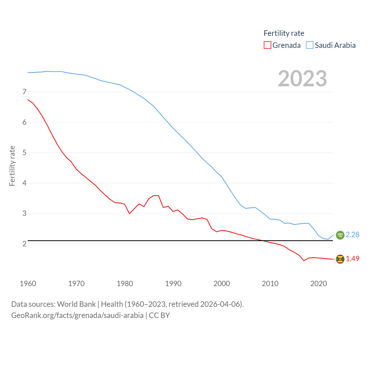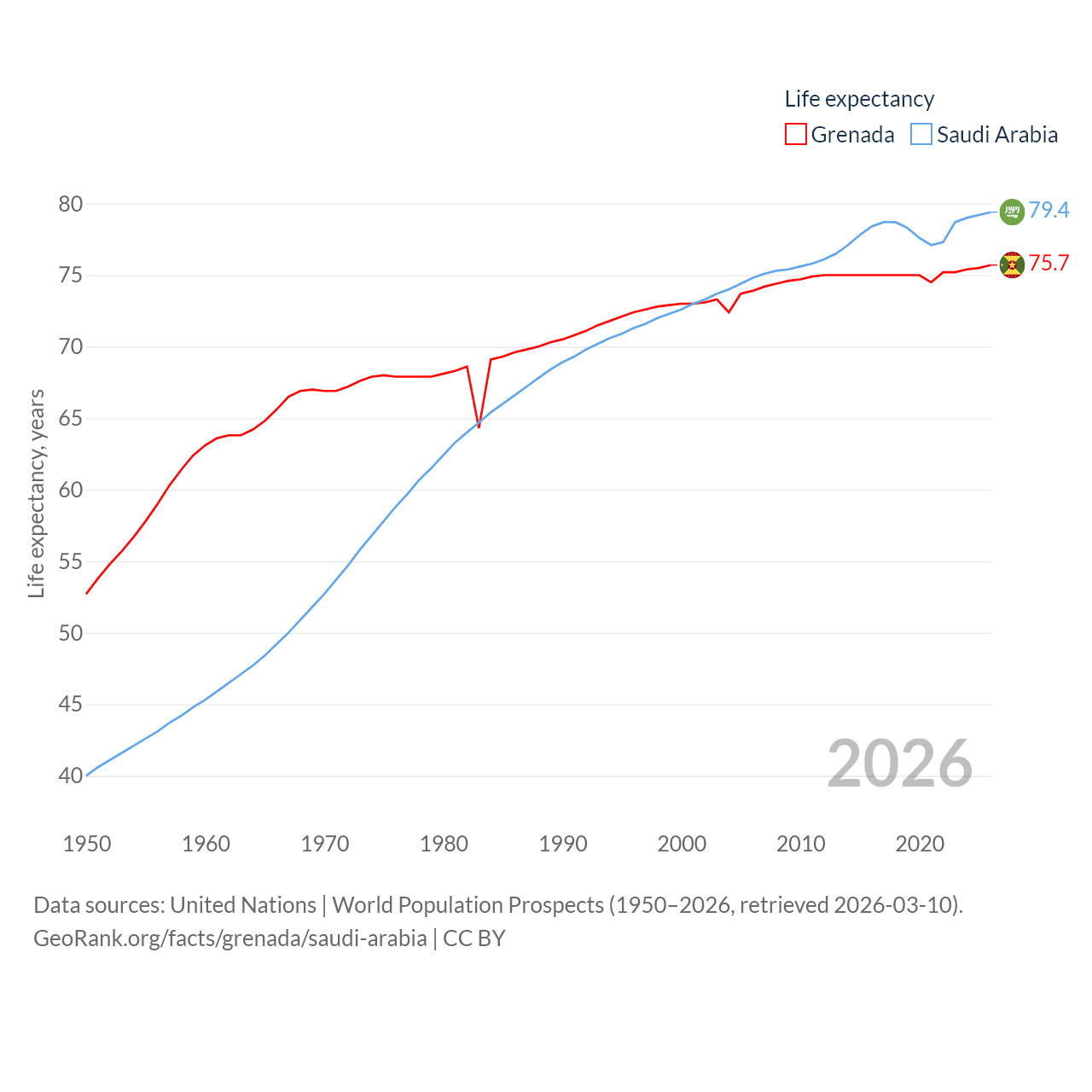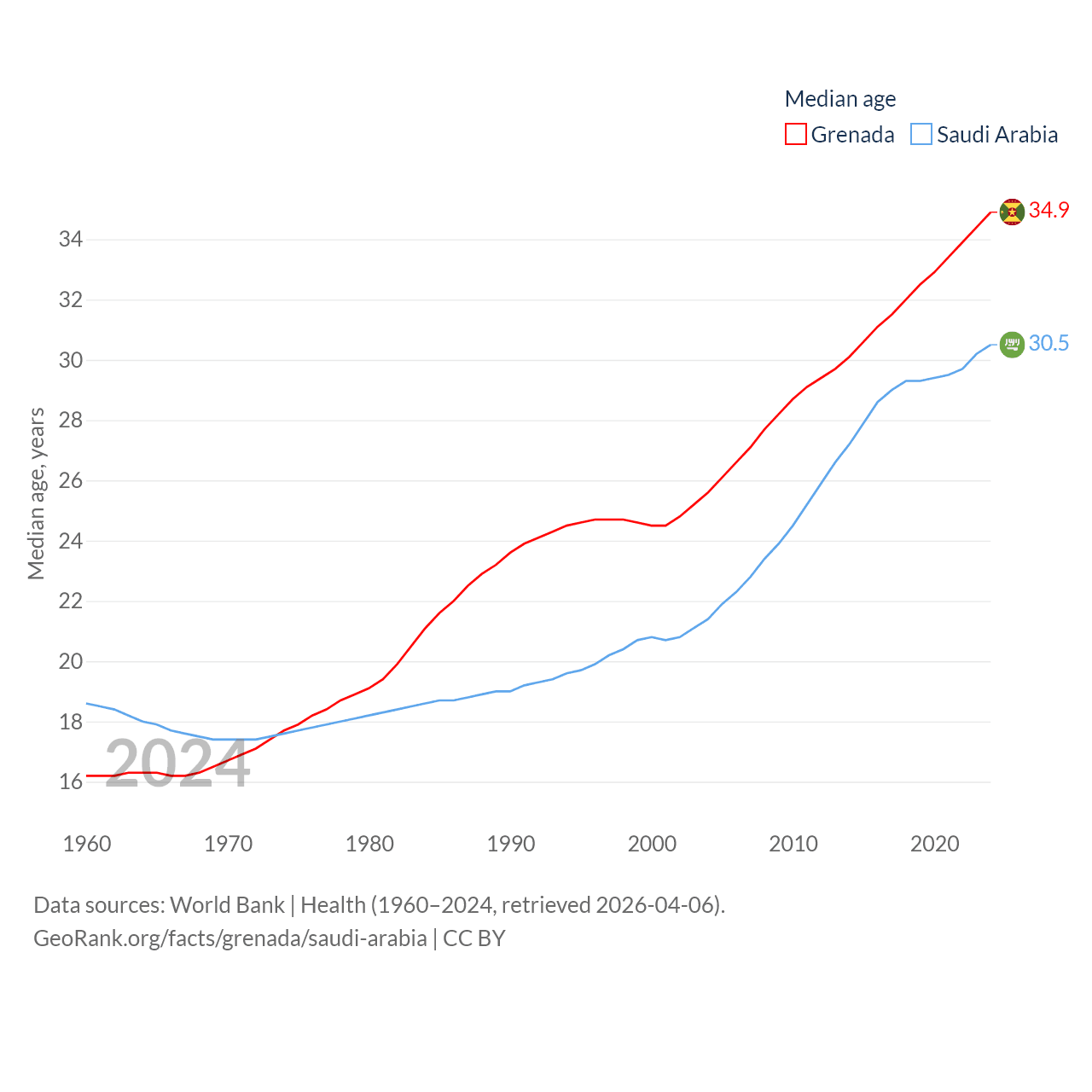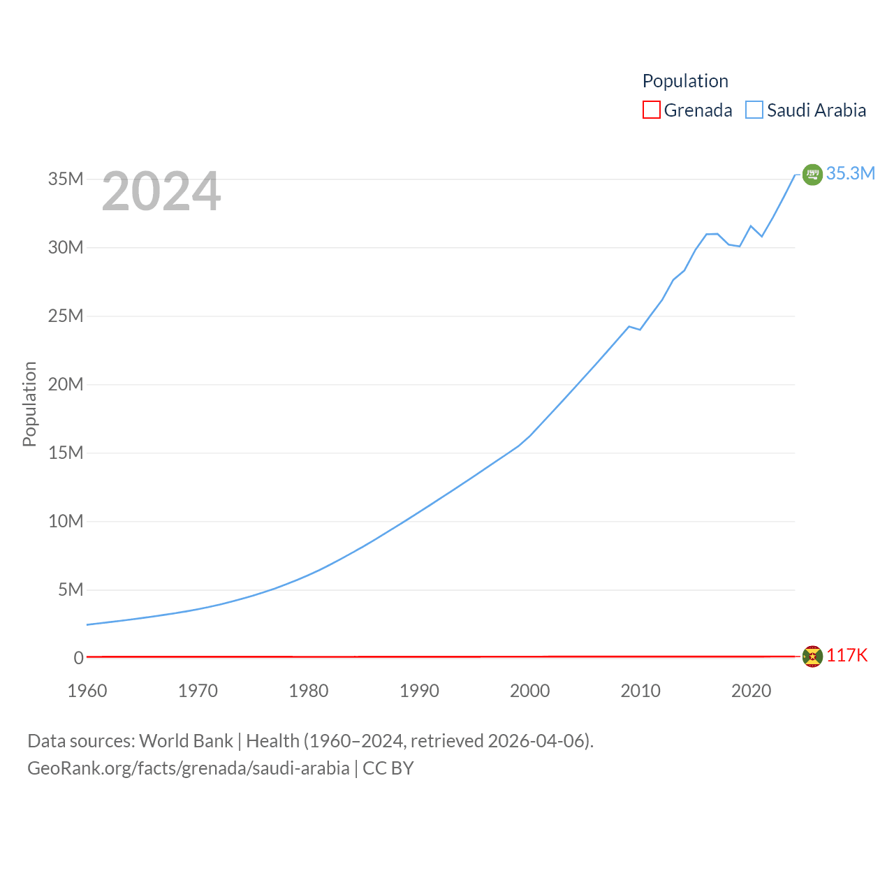 Grenada has a population of 117K (ranked 182/197), compared with 35.3M in Saudi Arabia (ranked 45/197). Grenada's land area is 131.3 sq mi versus 830,000 sq mi for Saudi Arabia (ranked 186th vs. 12th).