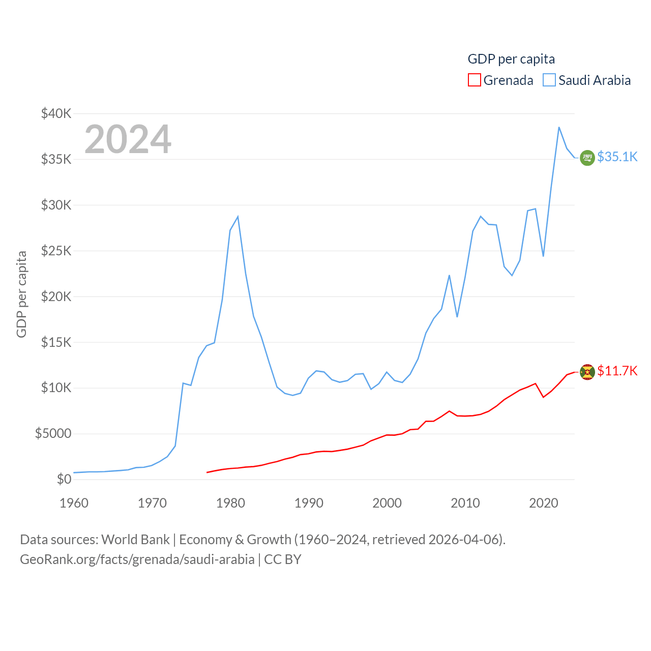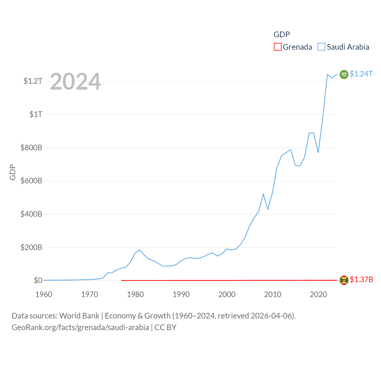 By GDP, Grenada ranks 184/197 ($1.37B) and Saudi Arabia ranks 18/197 ($1.24T). By GDP per capita, Grenada ranks 80/197 ($11,705), while Saudi Arabia ranks 33/197 ($35,122).