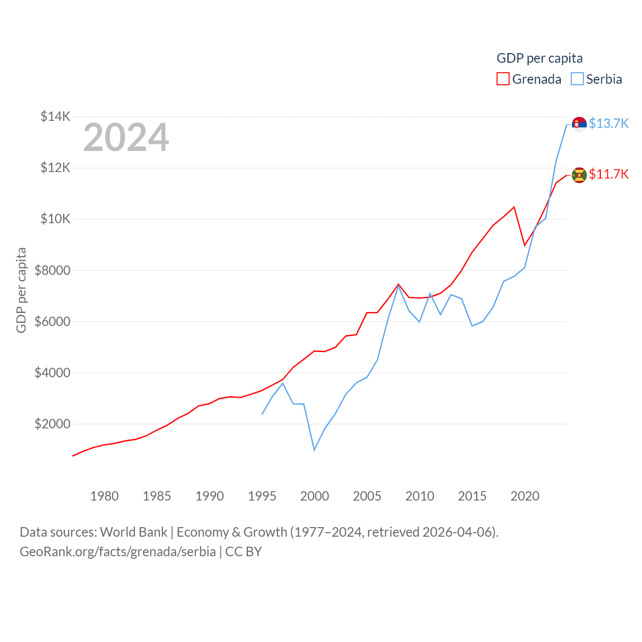 By GDP, Grenada ranks 184/197 ($1.37B) and Serbia ranks 76/197 ($90.1B). By GDP per capita, Grenada ranks 80/197 ($11,705), while Serbia ranks 73/197 ($13,679).