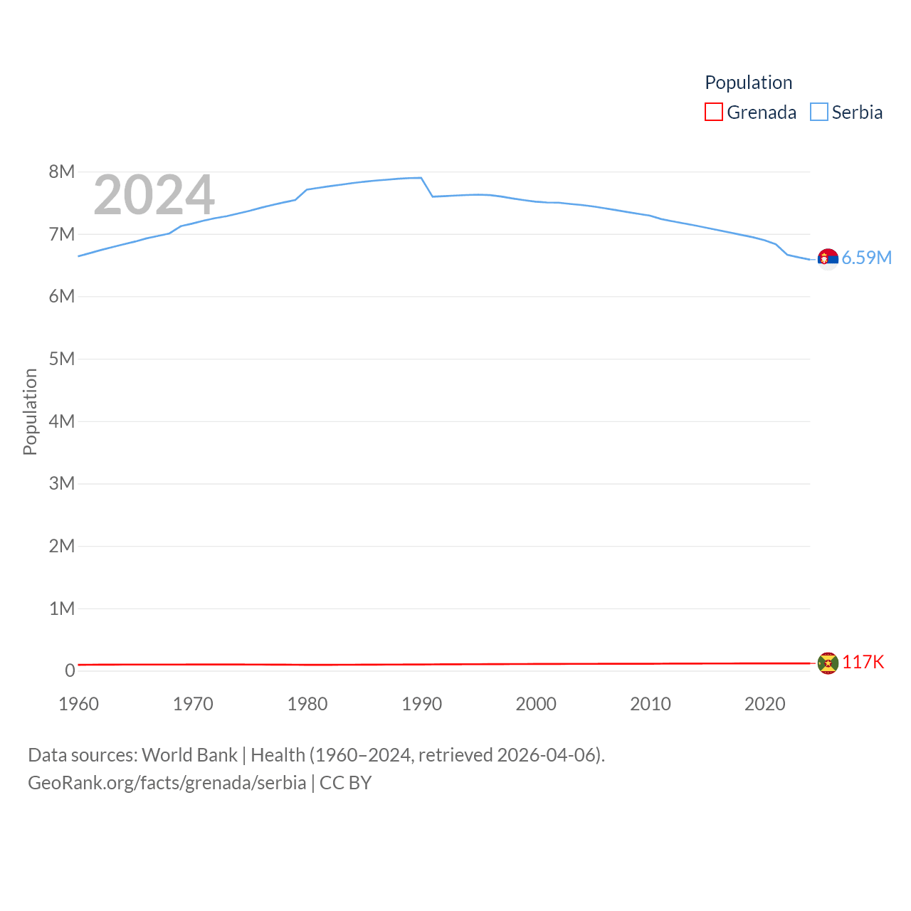 Grenada has a population of 117K (ranked 182/197), compared with 6.59M in Serbia (ranked 109/197). Grenada's land area is 131.3 sq mi versus 32,467 sq mi for Serbia (ranked 186th vs. 111th).