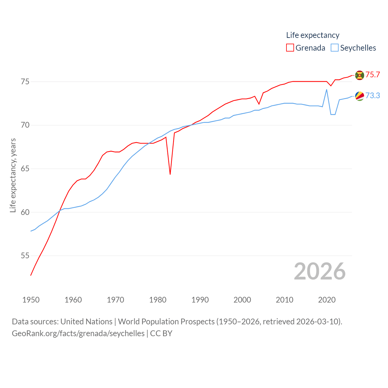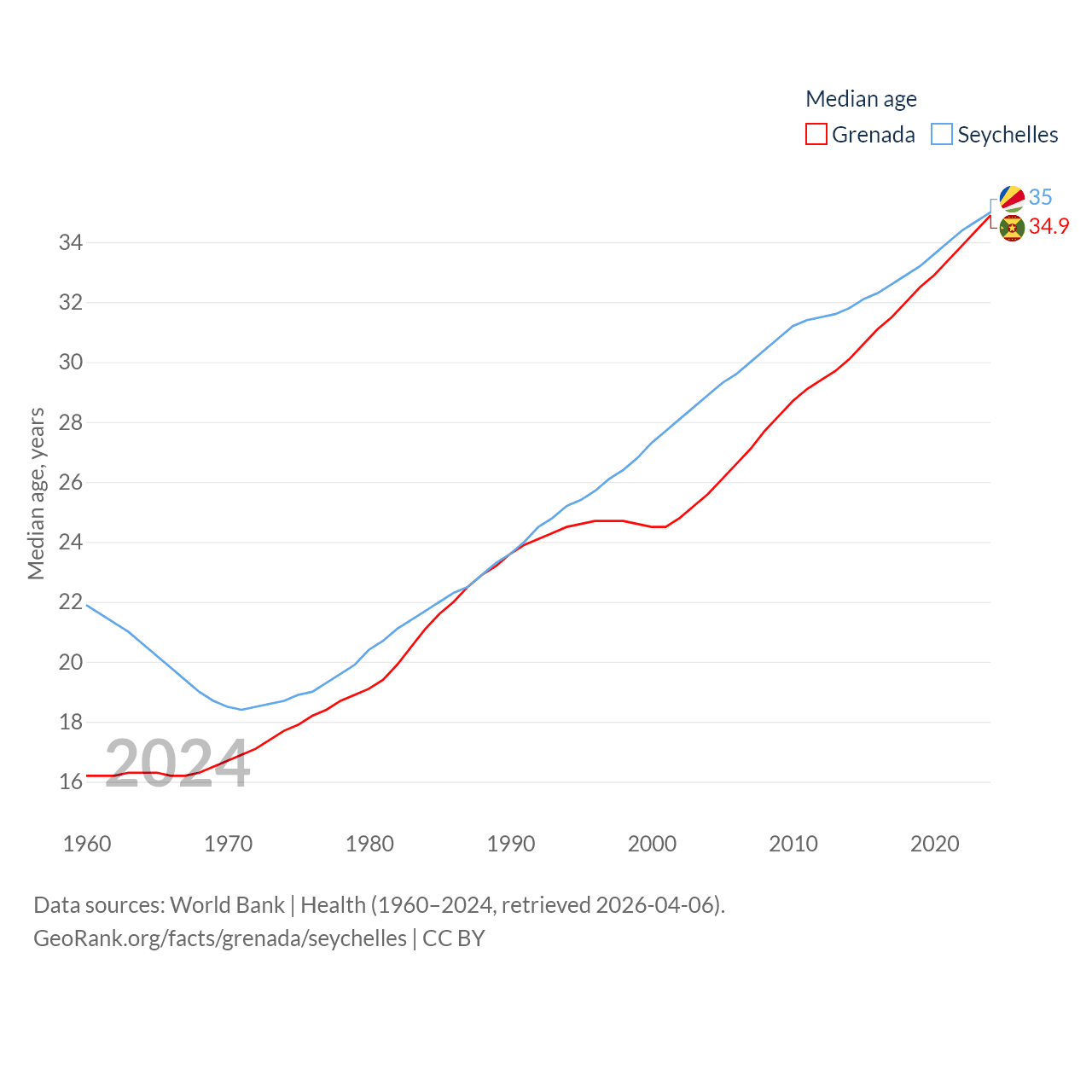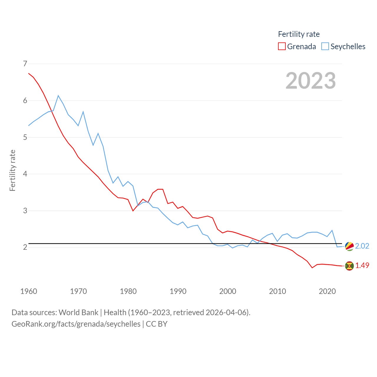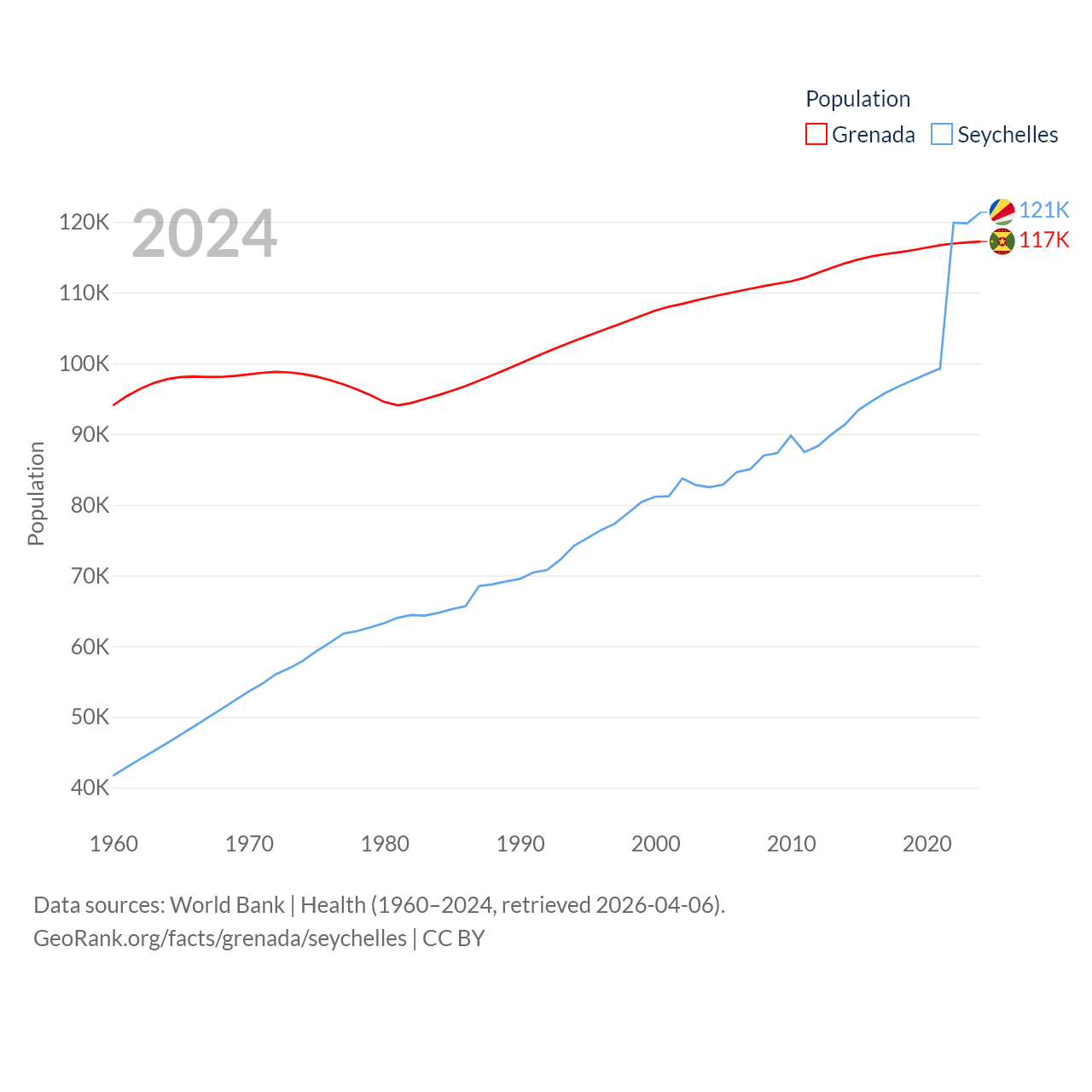 Grenada has a population of 117K (ranked 182/197), compared with 121K in The Seychelles (ranked 181/197). Grenada's land area is 131.3 sq mi versus 177.6 sq mi for The Seychelles (ranked 186th vs. 181st).