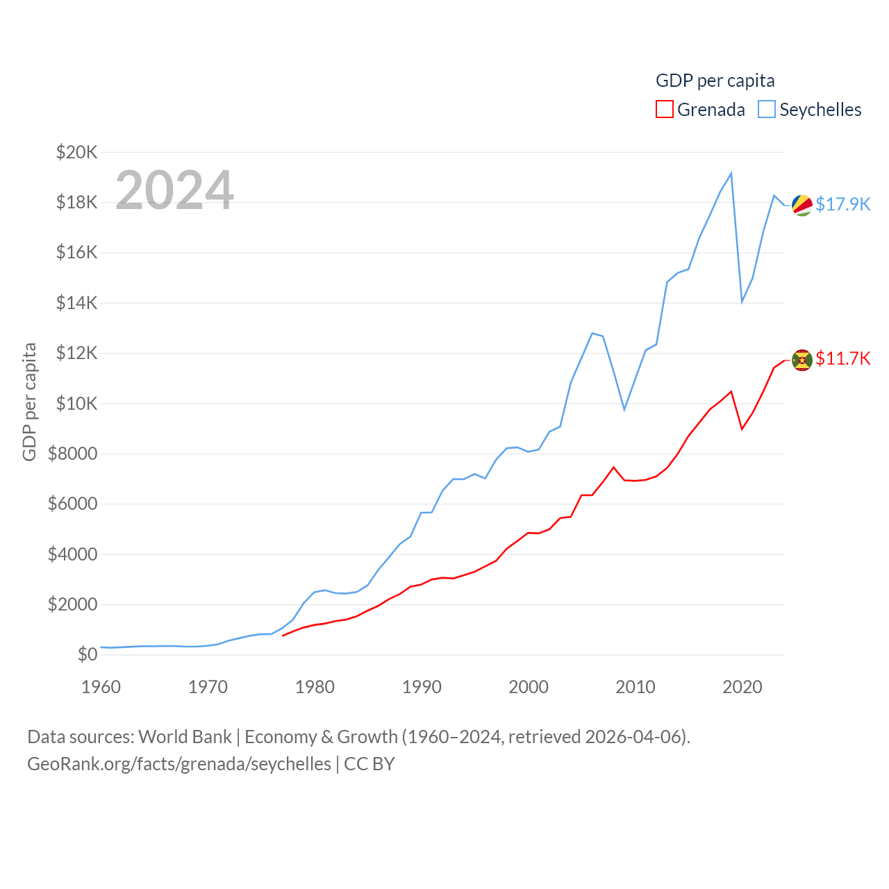 By GDP, Grenada ranks 184/197 ($1.37B) and The Seychelles ranks 178/197 ($2.17B). By GDP per capita, Grenada ranks 80/197 ($11,705), while The Seychelles ranks 63/197 ($17,859).