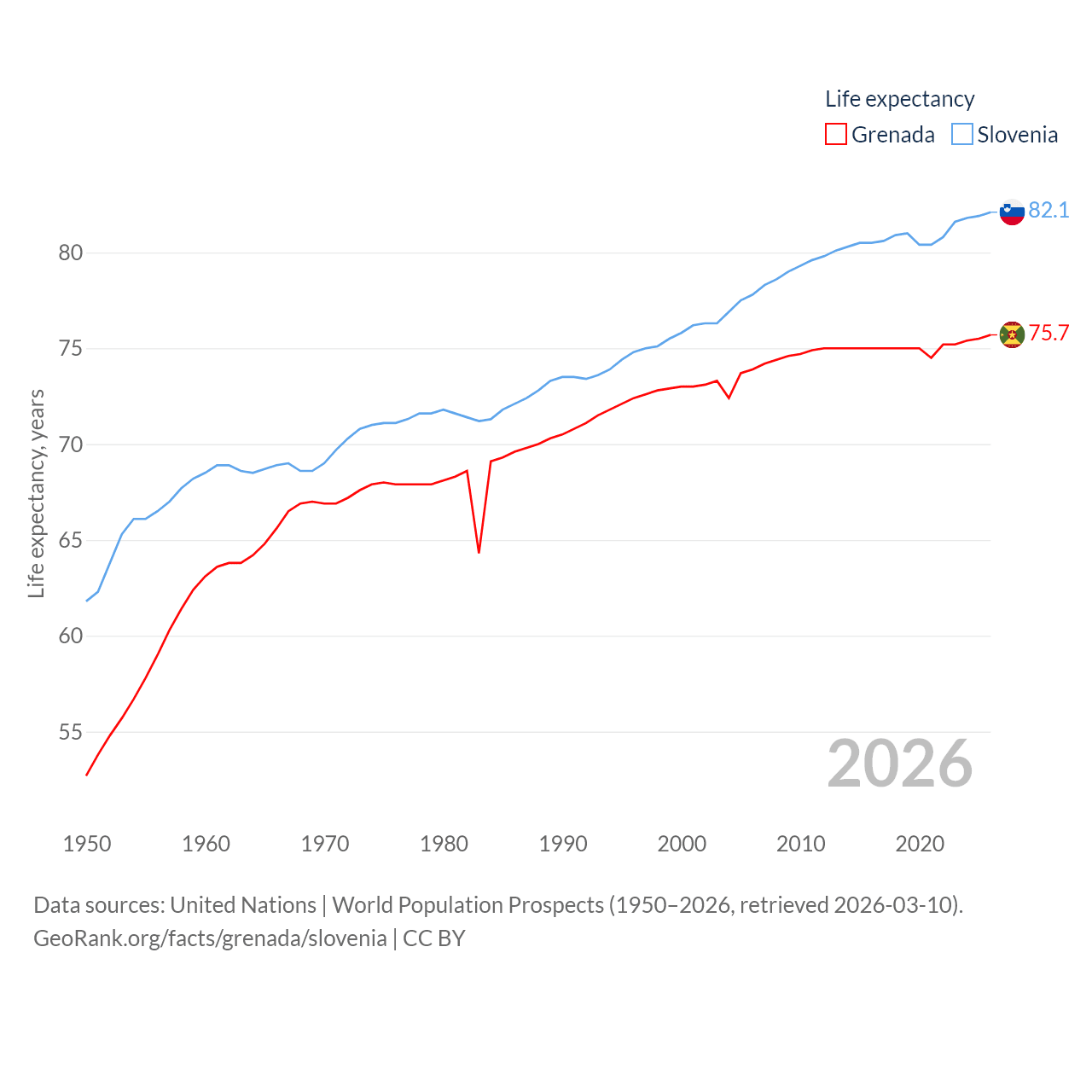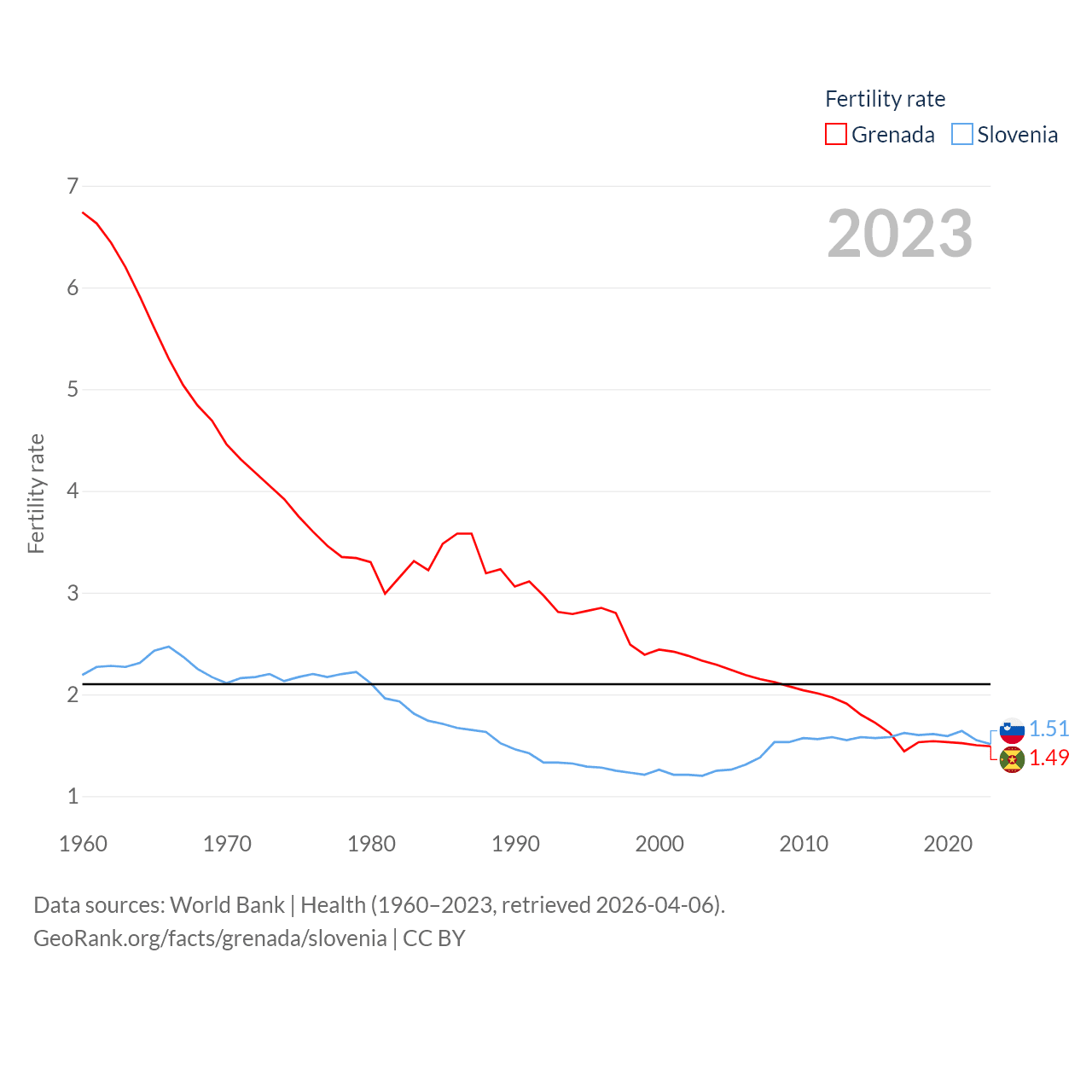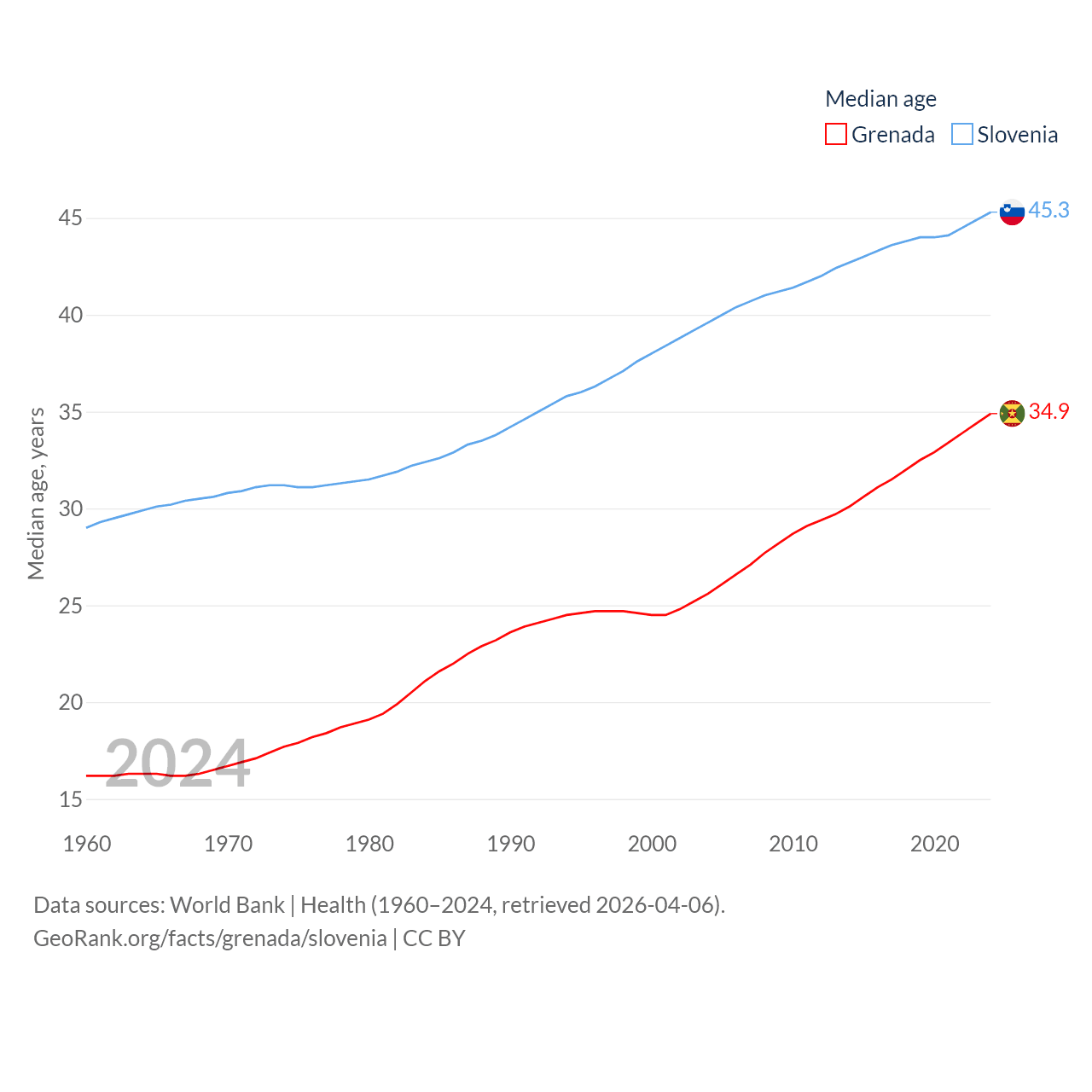 Grenada has a population of 117K (ranked 182/197), compared with 2.13M in Slovenia (ranked 147/197). Grenada's land area is 131.3 sq mi versus 7,774 sq mi for Slovenia (ranked 186th vs. 151st).