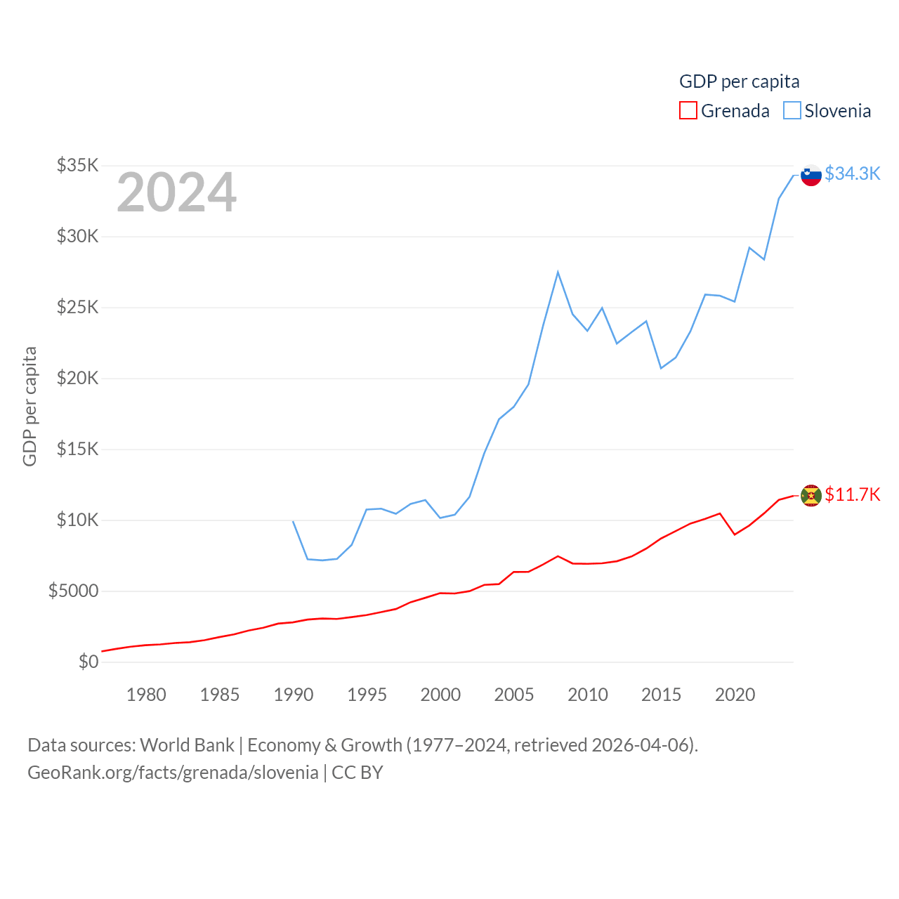 By GDP, Grenada ranks 184/197 ($1.37B) and Slovenia ranks 86/197 ($73B). By GDP per capita, Grenada ranks 80/197 ($11,705), while Slovenia ranks 34/197 ($34,301).