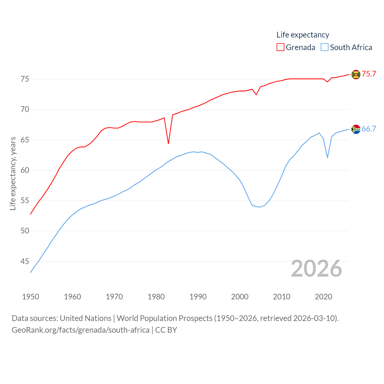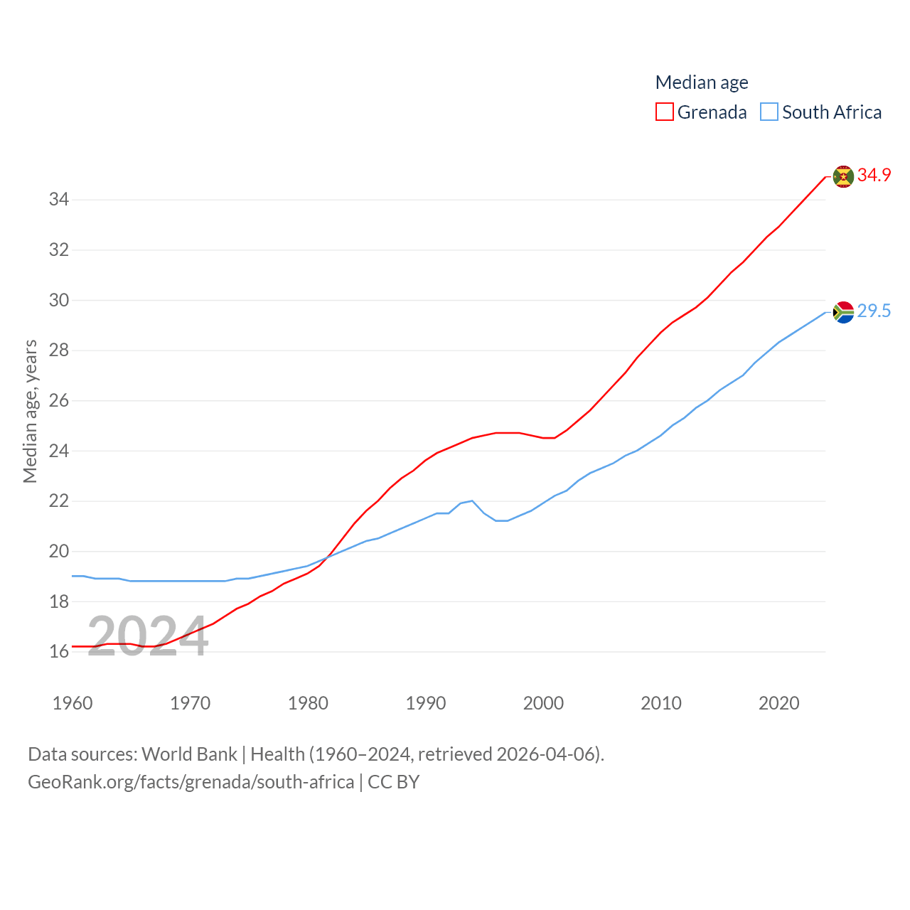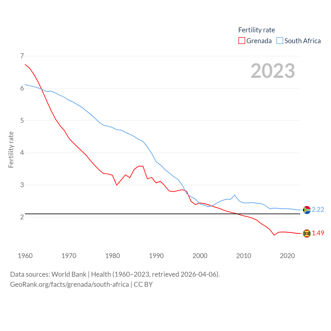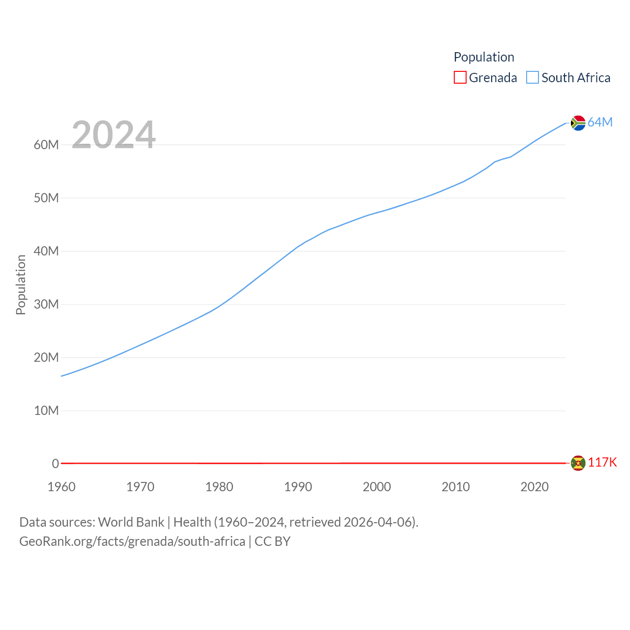 Grenada has a population of 117K (ranked 182/197), compared with 64M in South Africa (ranked 24/197). Grenada's land area is 131.3 sq mi versus 468,377 sq mi for South Africa (ranked 186th vs. 24th).