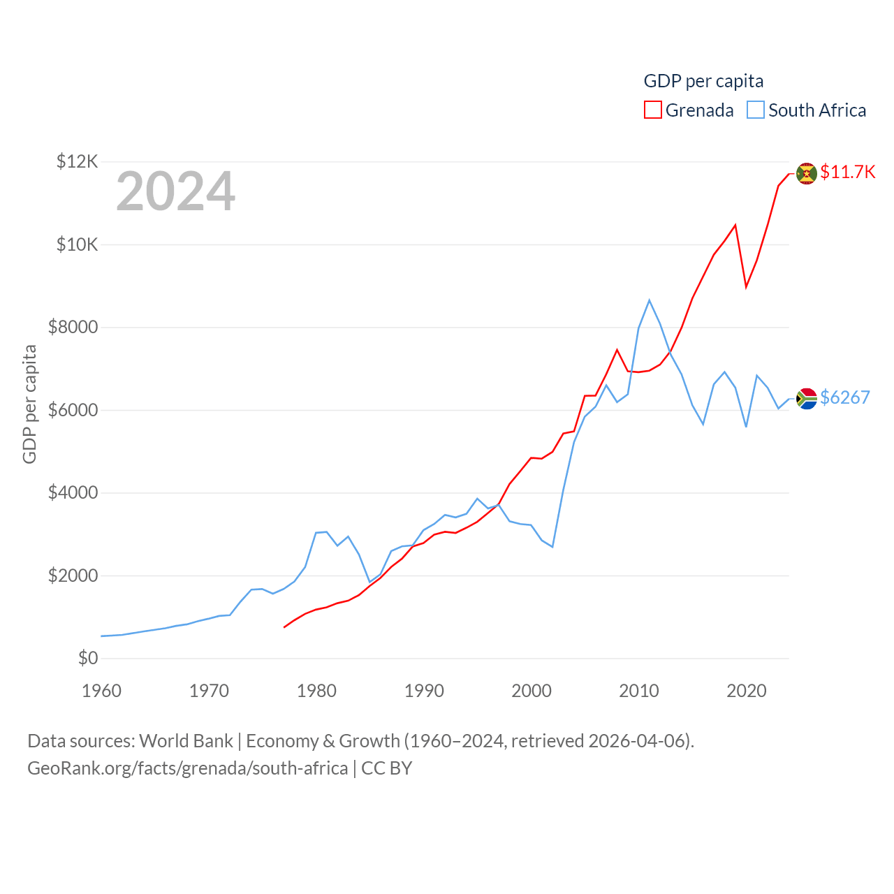 By GDP, Grenada ranks 184/197 ($1.37B) and South Africa ranks 40/197 ($401B). By GDP per capita, Grenada ranks 80/197 ($11,705), while South Africa ranks 111/197 ($6,267).