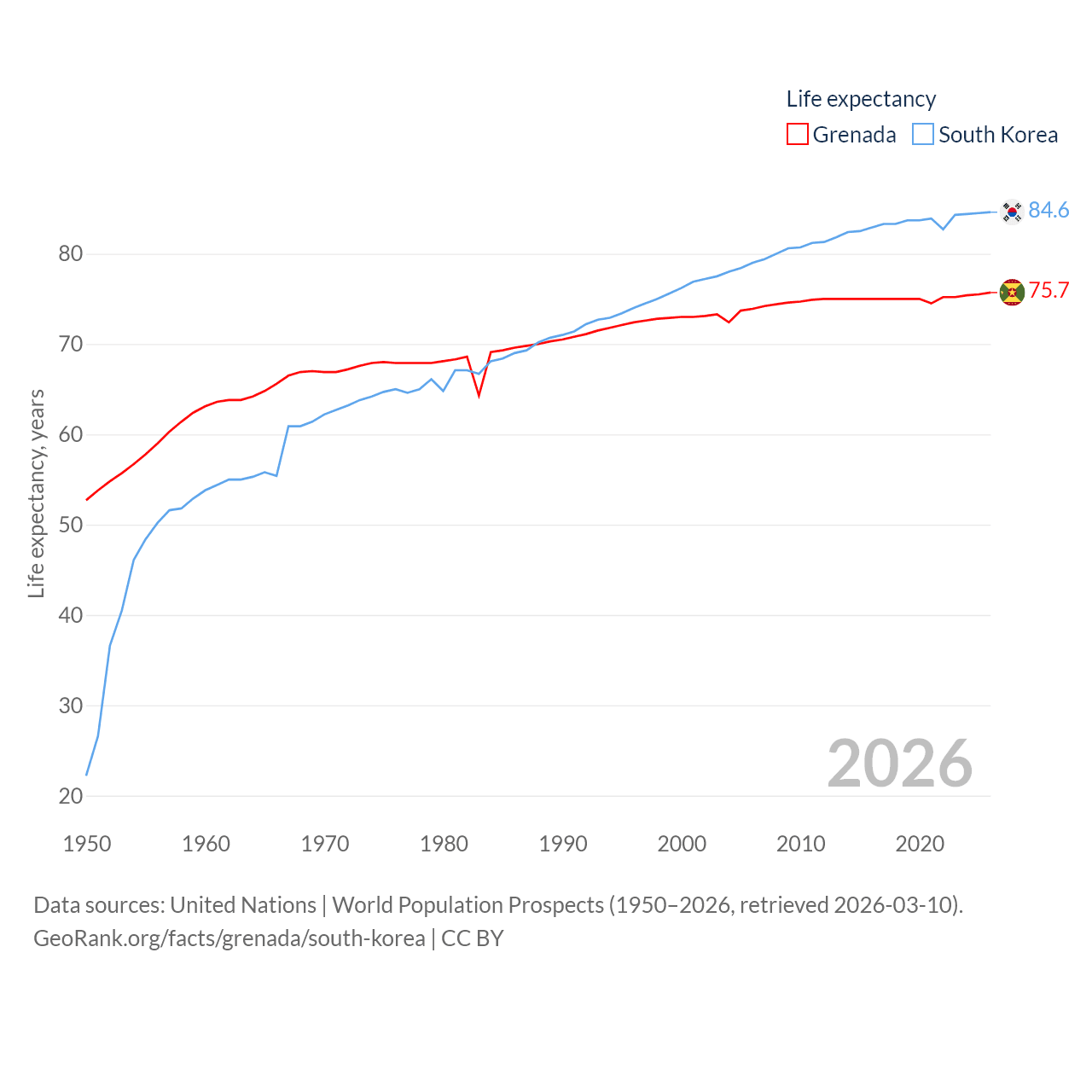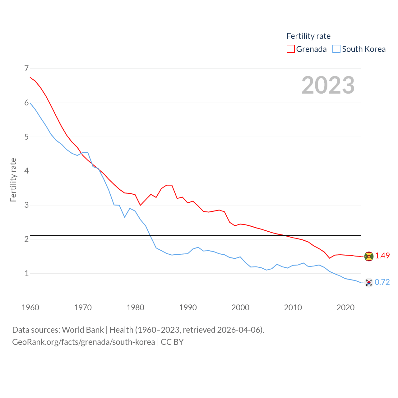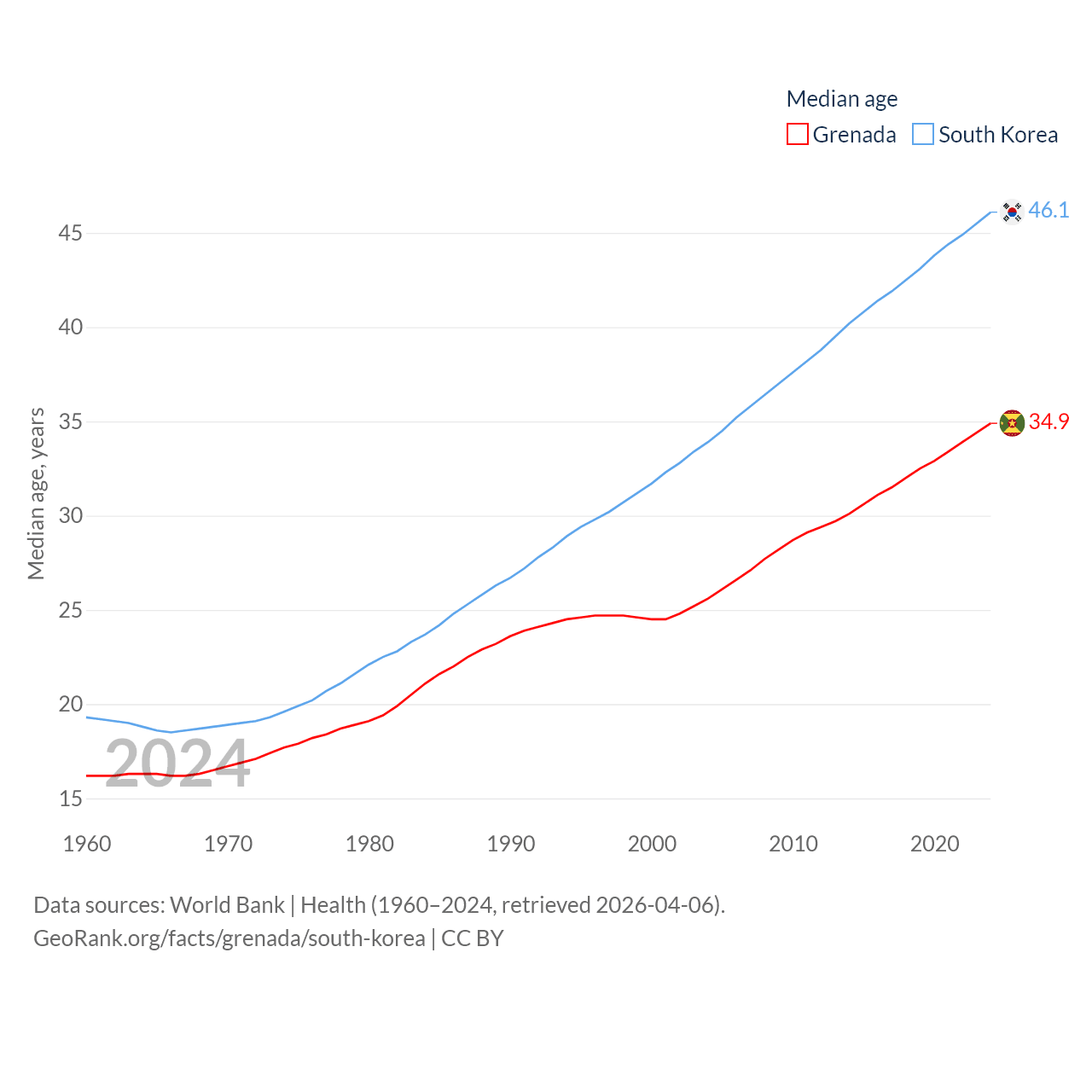 Grenada has a population of 117K (ranked 182/197), compared with 51.8M in South Korea (ranked 29/197). Grenada's land area is 131.3 sq mi versus 37,684 sq mi for South Korea (ranked 186th vs. 105th).