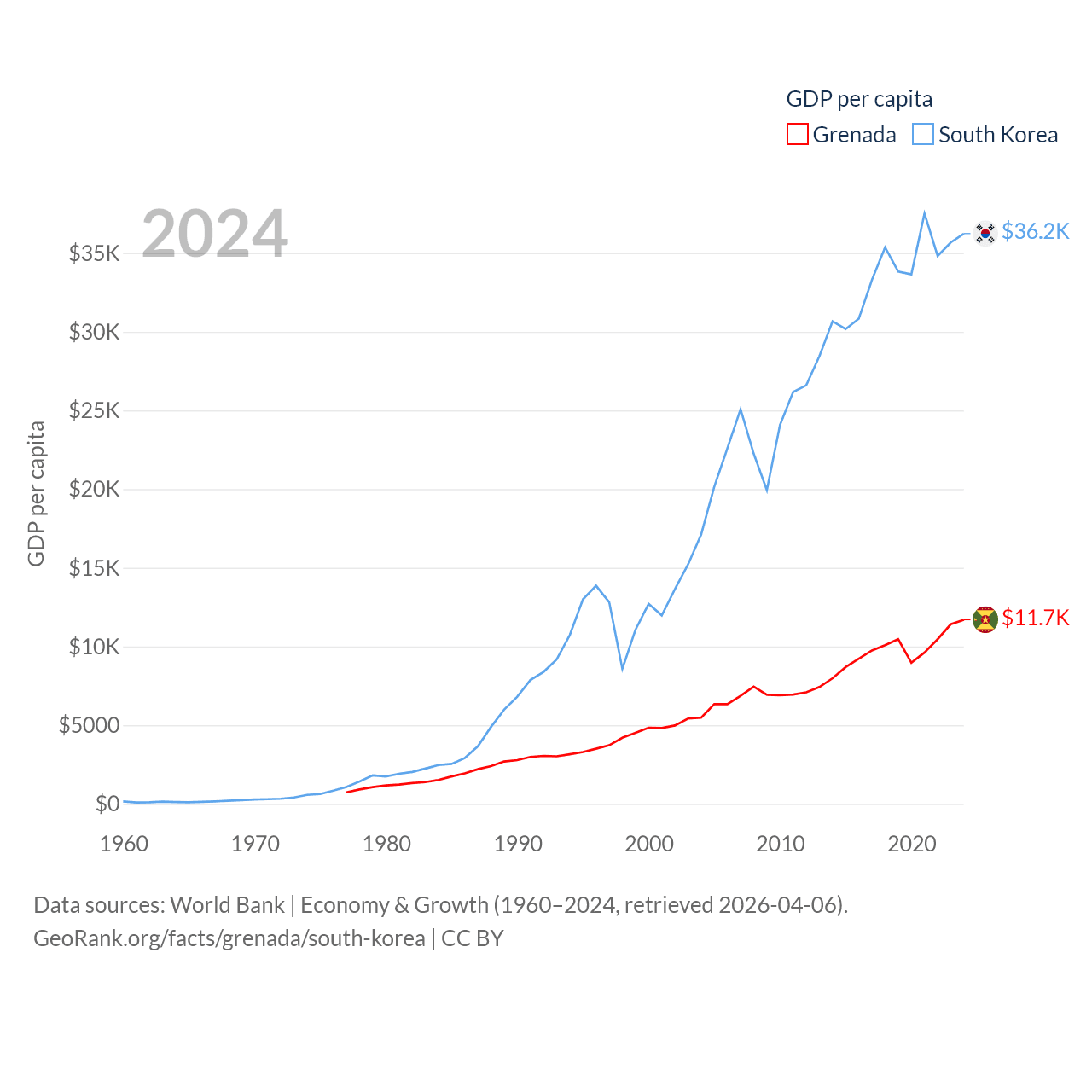 By GDP, Grenada ranks 184/197 ($1.37B) and South Korea ranks 12/197 ($1.88T). By GDP per capita, Grenada ranks 80/197 ($11,705), while South Korea ranks 31/197 ($36,239).