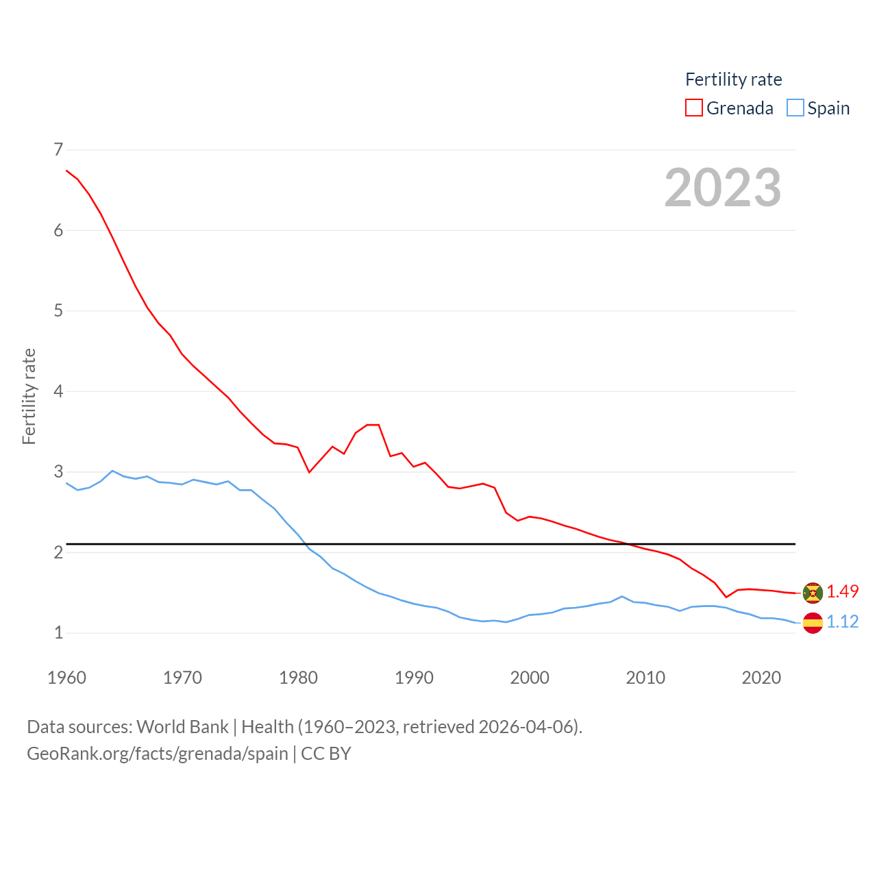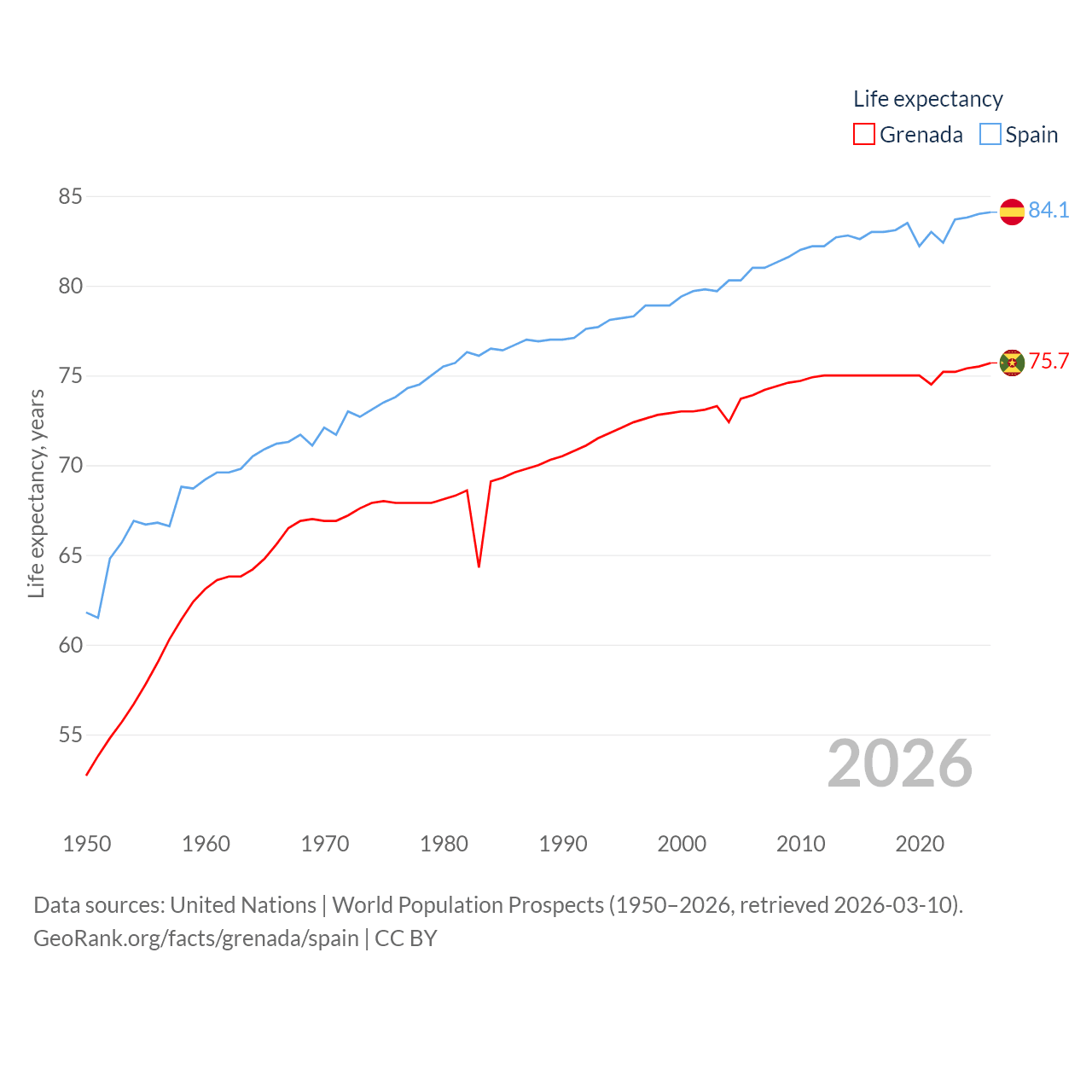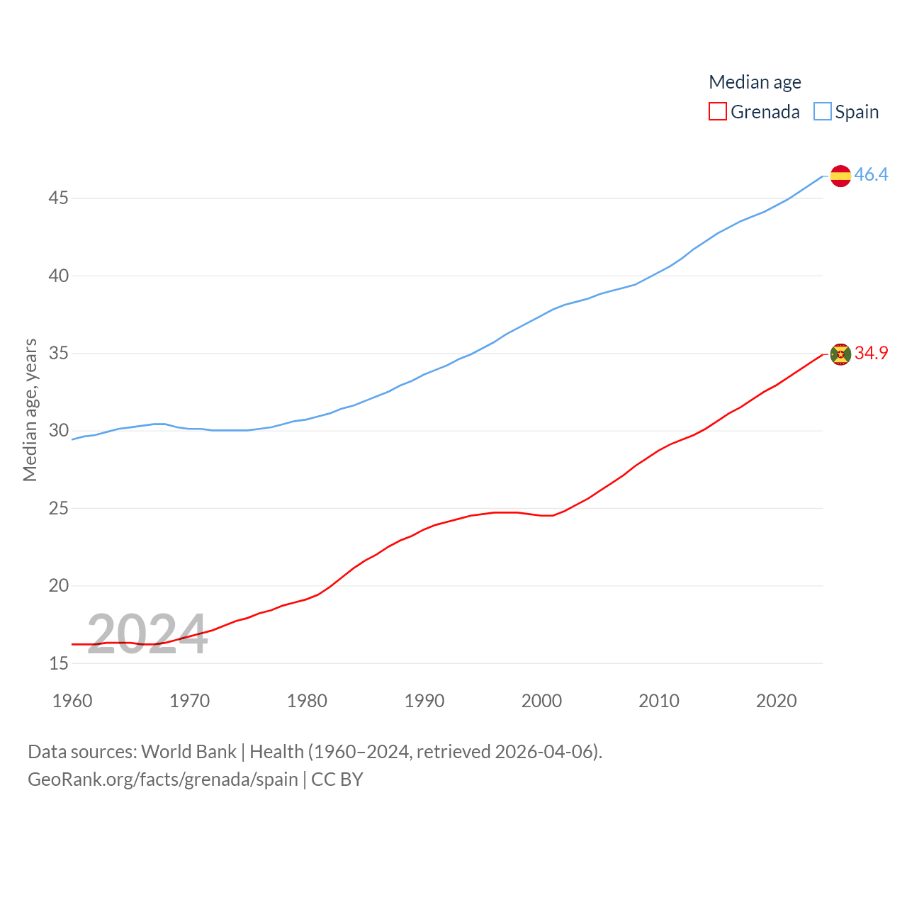 Grenada has a population of 117K (ranked 182/197), compared with 48.8M in Spain (ranked 32/197). Grenada's land area is 131.3 sq mi versus 192,934 sq mi for Spain (ranked 186th vs. 51st).