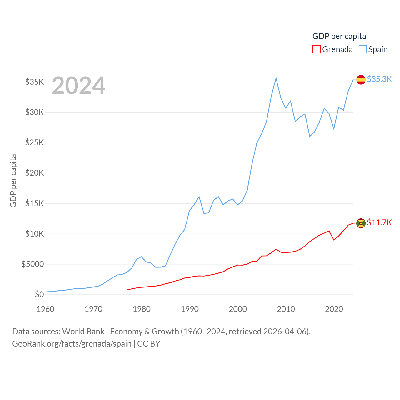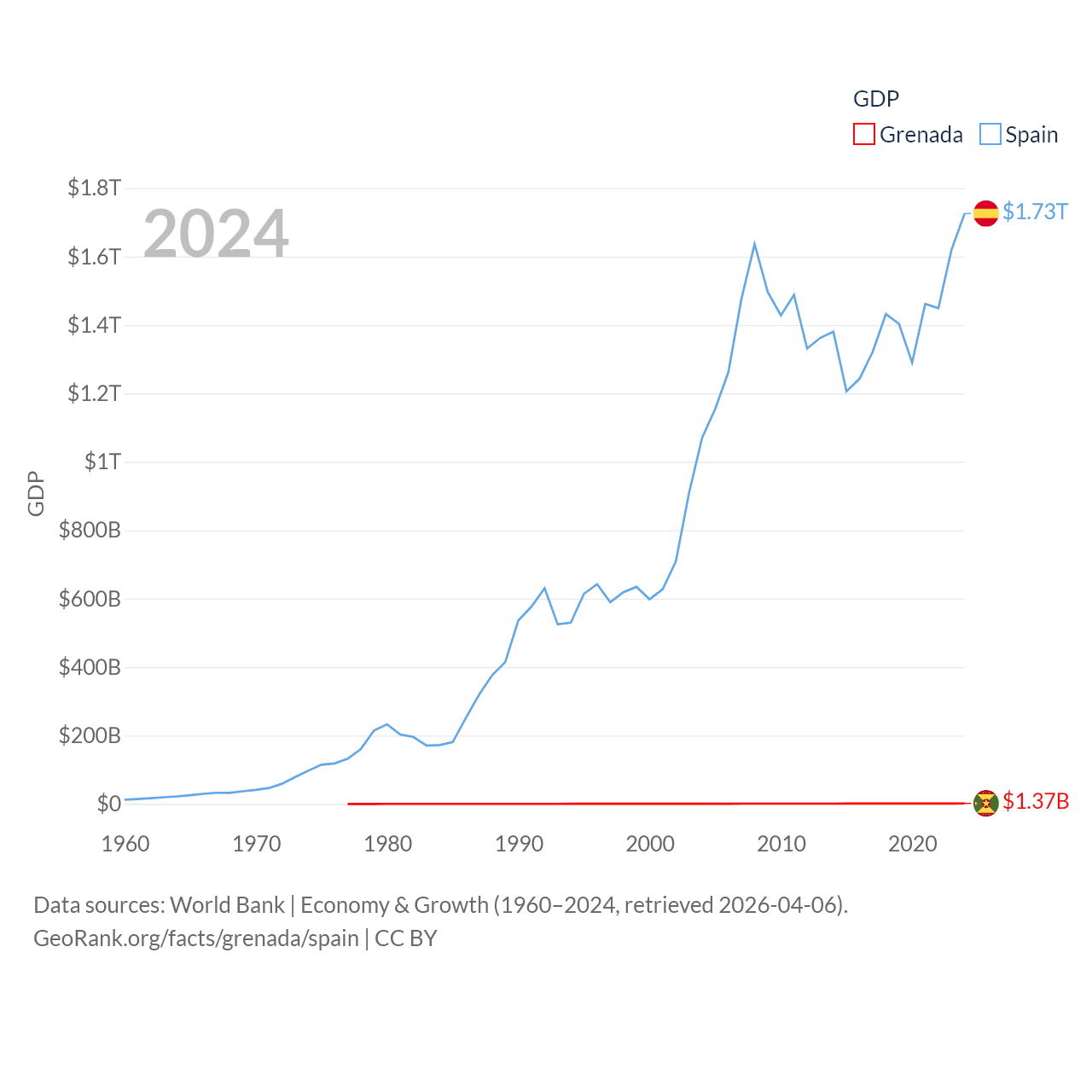 By GDP, Grenada ranks 184/197 ($1.37B) and Spain ranks 15/197 ($1.73T). By GDP per capita, Grenada ranks 80/197 ($11,705), while Spain ranks 32/197 ($35,327).