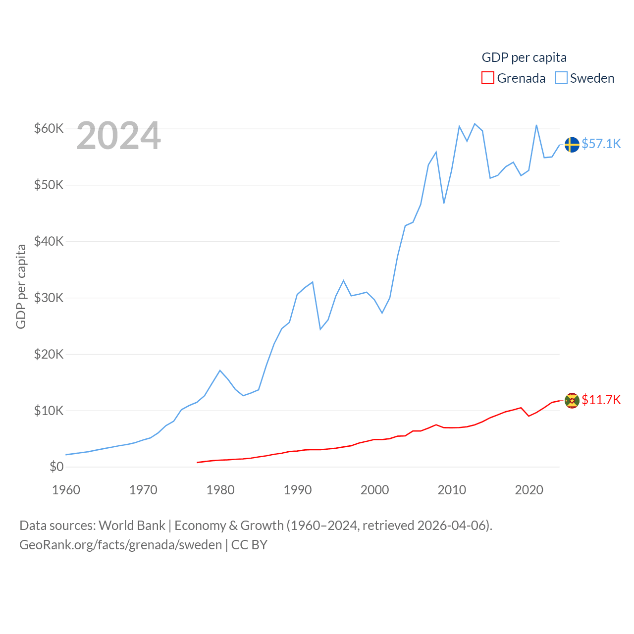 By GDP, Grenada ranks 184/197 ($1.37B) and Sweden ranks 26/197 ($604B). By GDP per capita, Grenada ranks 80/197 ($11,705), while Sweden ranks 17/197 ($57,117).