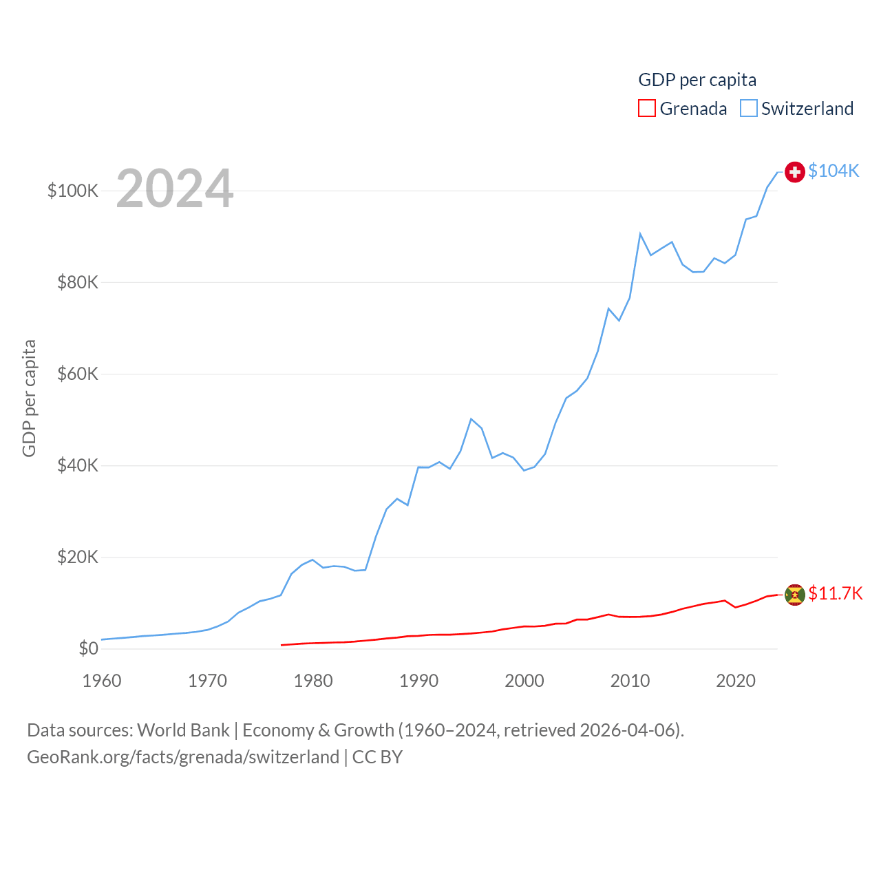 By GDP, Grenada ranks 184/197 ($1.37B) and Switzerland ranks 20/197 ($937B). By GDP per capita, Grenada ranks 80/197 ($11,705), while Switzerland ranks 5/197 ($103,998).